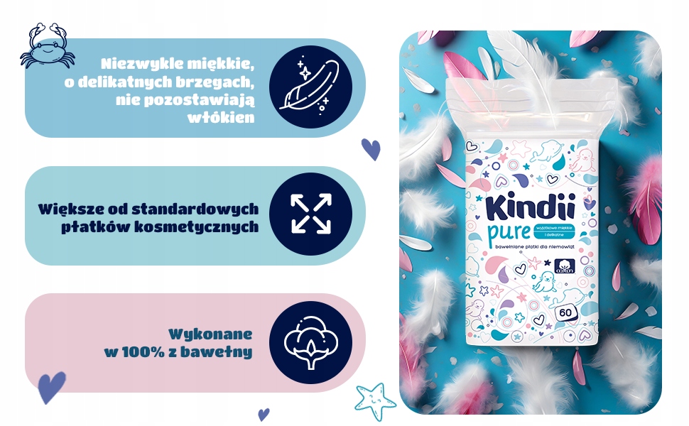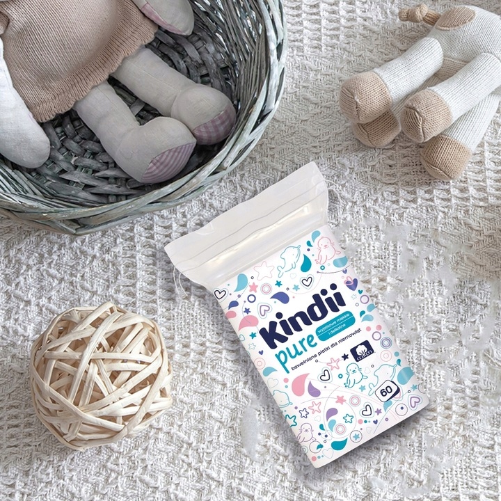 • Miękkość i bezpieczeństwo: Płatki wykonane są w 100% z bawełny i mają miękkie brzegi. Płatki Kindii Pure nie pozostawiają włókien i chronią delikatną skórę dziecka. Ich miękkość zapewnia przyjemne uczucie podczas codziennej pielęgnacji.