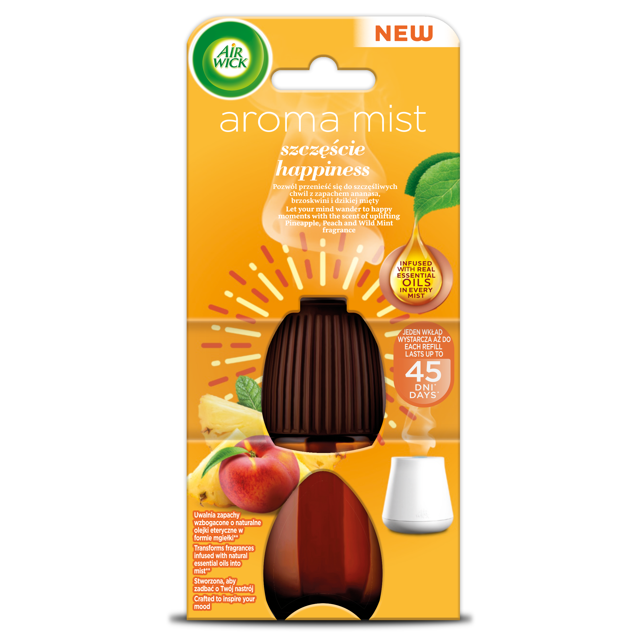 Air Wick Aromatyczna Mgiełka Szczęście uwalnia pachnącą mgiełkę nawet przez 45 dni*. Urządzenie wyposażyliśmy w funkcję stand-by, dzięki której pracuje w dwóch cyklach — uwalnia mgiełkę przez 8 godzin, po czym przechodzi w stan uśpienia na kolejne 16 godzin. Odświeżacz dozuje uwalnianie mgiełki zapewniając optymalne rozproszenie zapachu.