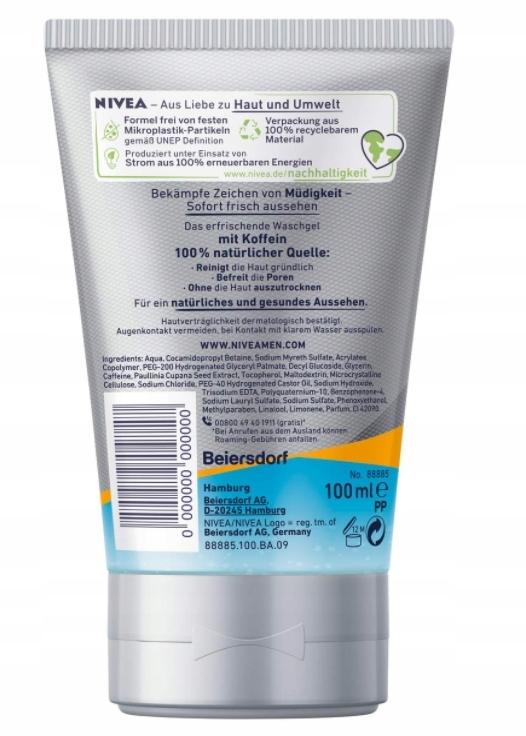 NIVEA MEN Active Energy Energetyzujący żel do mycia twarzy z kofeiną pochodzącą w 100% z naturalnego źródła. Żel do mycia twarzy męski przeznaczony jest do codziennej pielęgnacji – skutecznie usuwa zanieczyszczenia i nadmiar sebum, nie przesuszając skóry. Żel oczyszczający ale również zmiękczający zarost i ułatwiając golenie. Żel do twarzy dodaje skórze energii i zapewnia jej zdrowy wygląd. Twoja twarz wygląda na zdrową i zadbaną. Formuła jest bez mikroplastiku zgodnie z definicja UNEP. Do wyprodukowania tego produktu pozyskano 100% energii elektrycznej z odnawialnych źródeł w centrach produkcyjnych. Tolerancja dla skóry formuły została potwierdzona dermatologicznie.