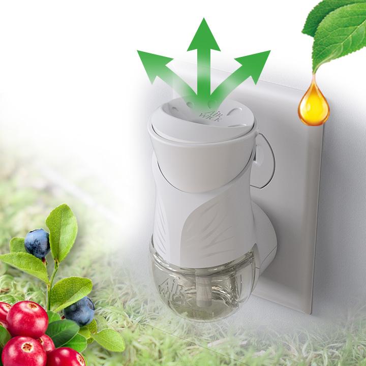 Pozwól swoim zmysłom powędrować do leśnej kryjówki pełnej świeżości i soczystszości dzięki połączeniu wody kokosowej, świeżej mięty i dzikich jagód. Elektryczny odświeżacz powietrza Air Wick skutecznie eliminuje nieprzyjemne zapachy i jest wyjątkowo trwały. Działa nawet przez 120 dni*. 5 poziomów intensywności pozwala Ci dowolnie dopasować klimat w pomieszczeniu tak, jak lubisz.