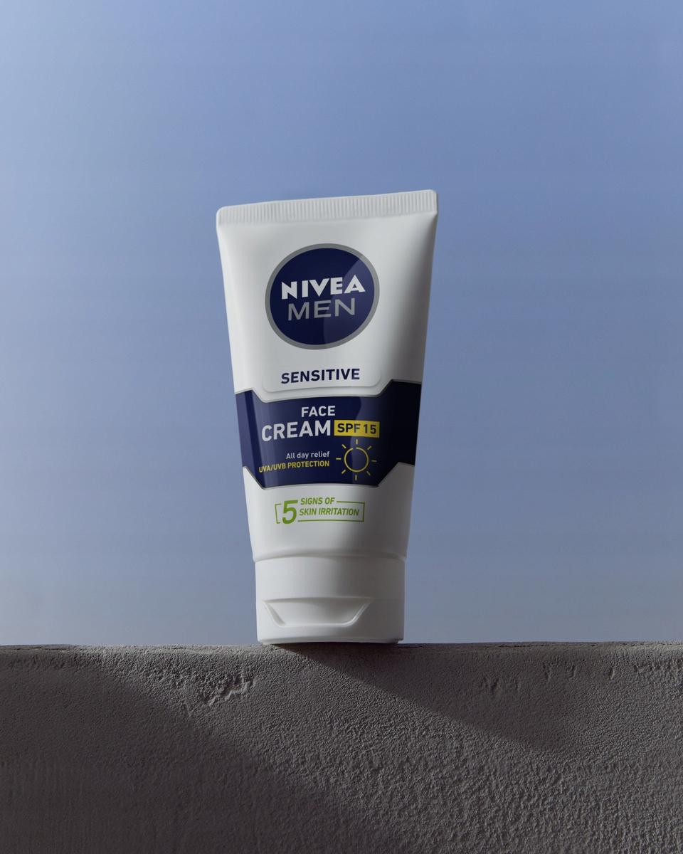 NIVEA MEN SENSITIVE Ochronny krem nawil偶aj膮cy do twarzy SPF 15 dba o podra偶nion膮 sk贸r臋 twarzy. Bezalkoholowa*, koj膮ca formu艂a z rumiankiem i witamin膮 E zapewnia ca艂odzienn膮 ulg臋 od 5 oznak podra偶nionej sk贸ry: pieczenia, zaczerwienienia, uczucia suchej i napi臋tej sk贸ry oraz sw臋dzenia.