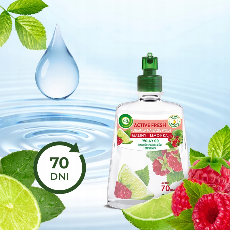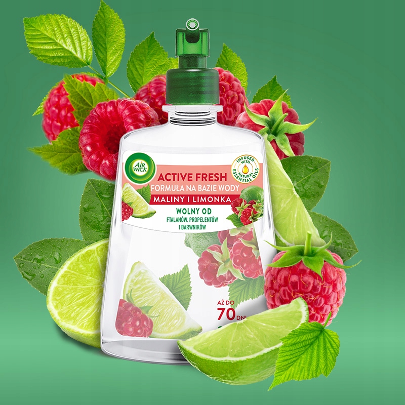 Zamknij oczy i przenieś się myślami do końcówki słonecznego lata. Ciekawe, co dzisiaj się wydarzy? Niespodziewana przygoda? Miłe spotkanie? Jak miło patrzeć na tylu uśmiechniętych ludzi! Wszyscy zrelaksowani, w letnich strojach. Na jednym straganie maliny, na drugim limonki… Natura hojnie obdarowuje nas swoimi darami, dlaczego nie czerpać z niej pełnymi garściami? Dzięki Air Wick 24/7 ACTIVE FRESH Maliny i Limonka poczujesz owocowe orzeźwienie, dzięki któremu zyskasz nową energię.