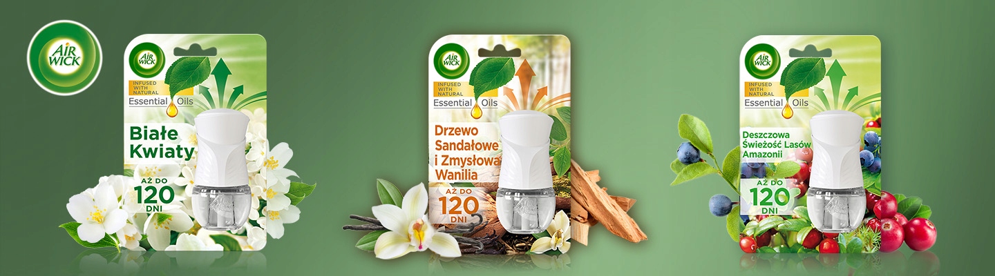 Dzięki Air Wick masz pewność, że Twój dom jest przytulny, zadbany oraz pięknie pachnie świeżością. Nasze zapachy zawierają składniki pochodzenia naturalnego** i pozwalają wyrazić siebie we własnej przestrzeni.
