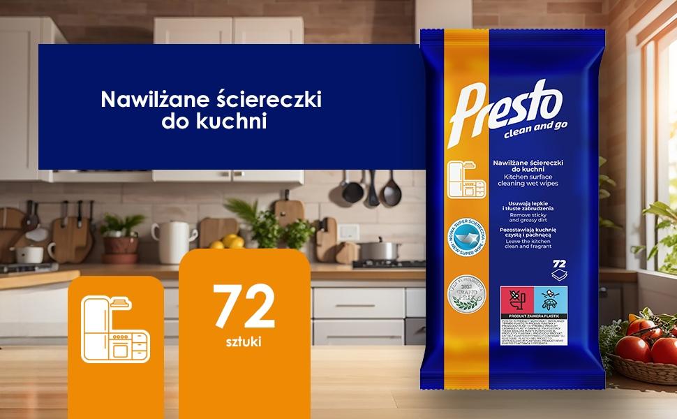• Efekt odświeżający: Ściereczki Presto do kuchni, oprócz skutecznego czyszczenia, odświeżają wnętrza i pozostawiają przyjemny, subtelny zapach, który utrzymuje się w pomieszczeniach i tworzy przyjemną atmosferę.