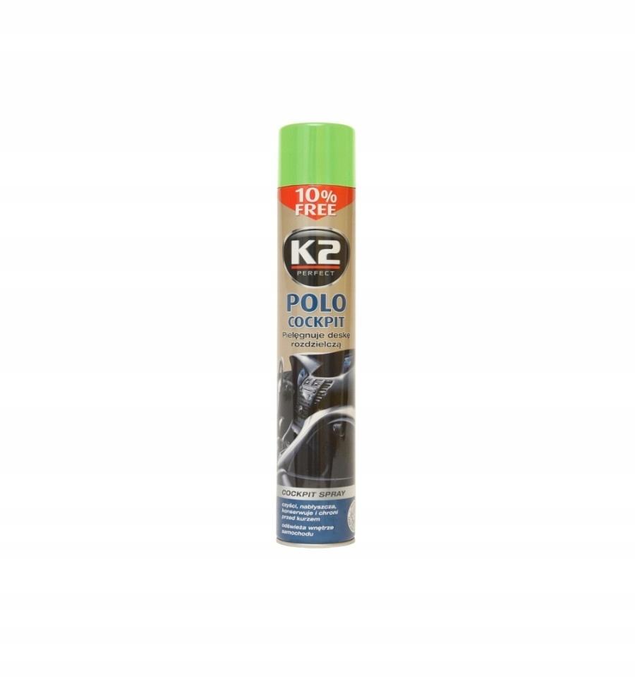 K2 POLO COCKPIT to spray do pielęgnacji i konserwacji deski rozdzielczej. Zawiera specjalne nanocząsteczki, dzięki którym w łatwy i szybki sposób zabezpieczy cały kokpit, przywróci głęboką barwę oraz wyrazistą fakturę czyszczonych elementów.
