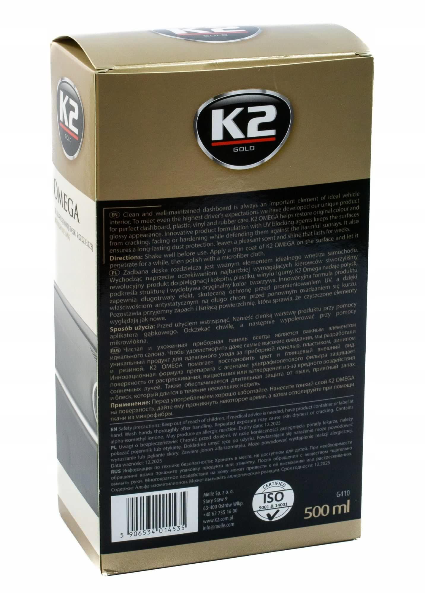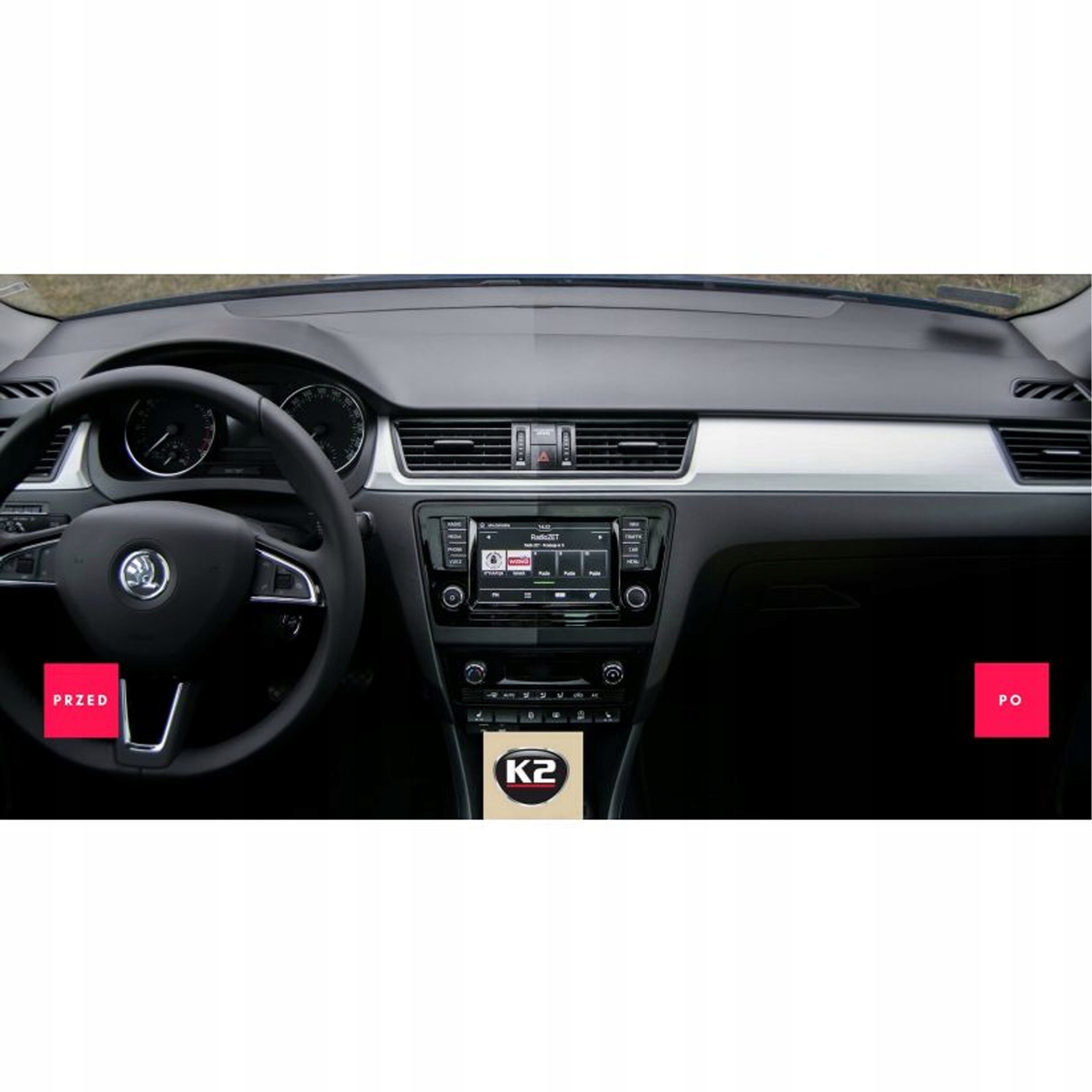 K2 OMEGA nadaje połysk, podkreśla strukturę i wydobywa oryginalny kolor tworzywa. Innowacyjna formuła produktu zapewniadługotrwały efekt, skuteczną ochronę przed promieniowaniem UV dzięki właściwościom antystatycznym na długo chroni przed ponownym osadzaniem się kurzu. Pozostawia przyjemny zapach i lśniącą powierzchnię, która sprawia, że czyszczone elementy wyglądają jak nowe.