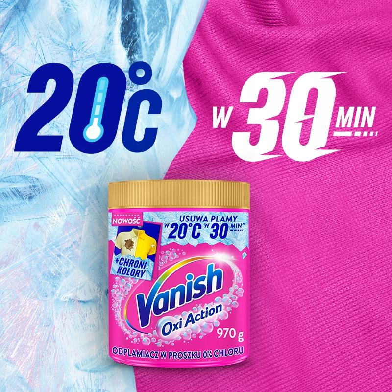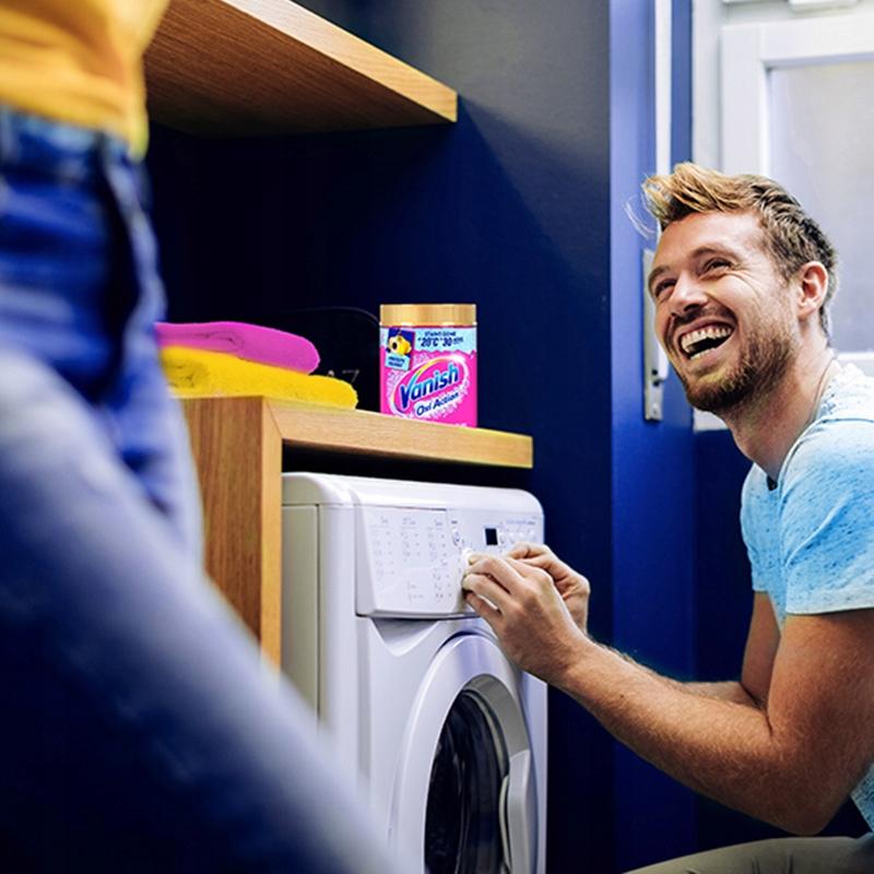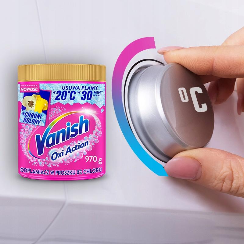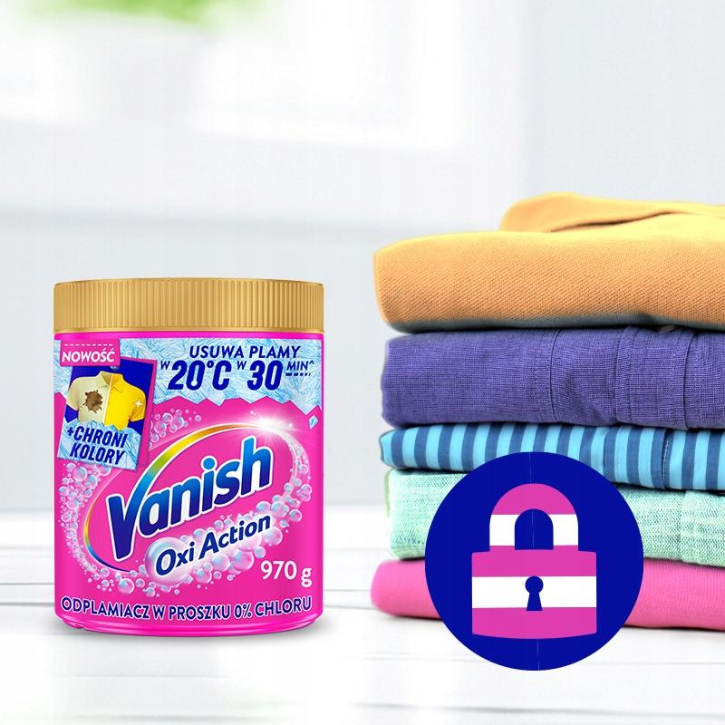 Ubrania żyją dłużej gdy pierzesz je w 20°C w 30-minutowym cyklu z nowym Vanish Oxi Action, który dodatkowo chroni tkaniny przed zafarbowaniem. Dodaj miarkę do każdego prania i ciesz się żywymi kolorami swoich ubrań bez plam i obaw o przebarwienia!