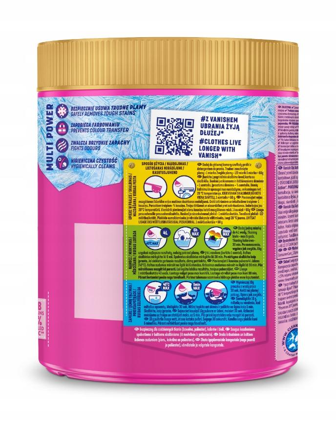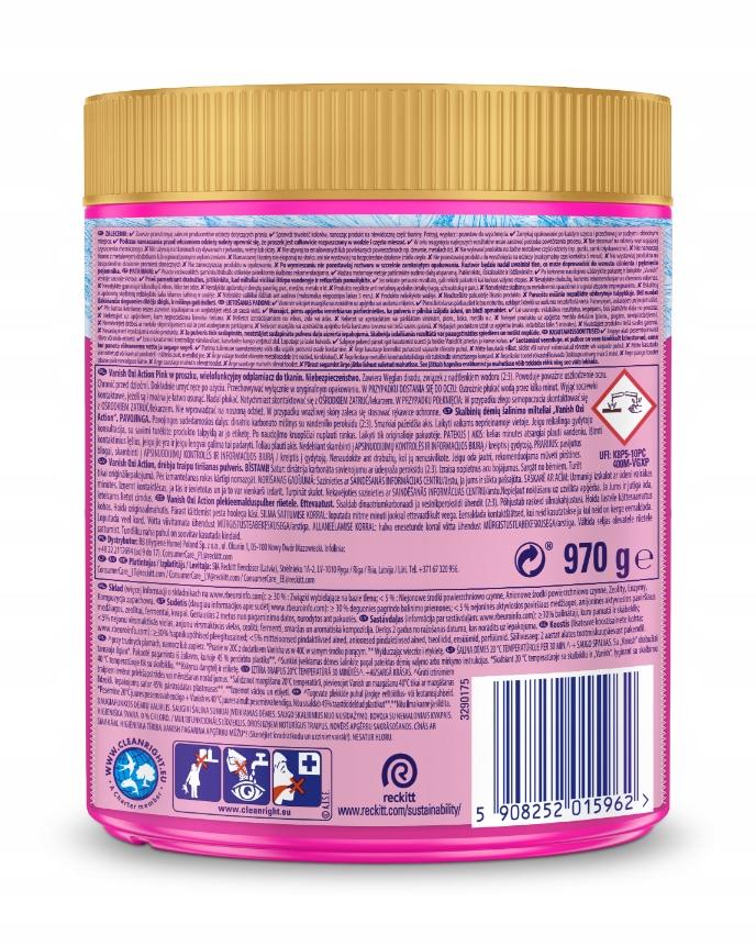 Vanish Oxi Action Pink w proszku, wielofunkcyjny odplamiacz do tkanin. Niebezpieczeństwo. Zawiera Węglan disodu, związek z nadtlenkiem wodoru (2:3). Powoduje poważne uszkodzenie oczu. Chronić przed dziećmi. Przechowywać wyłącznie w oryginalnym opakowaniu. Dokładnie umyć ręce po użyciu. W PRZYPADKU POŁKNIĘCIA: W przypadku złego samopoczucia skontaktować się z OŚRODKIEM ZATRUĆ. W PRZYPADKU DOSTANIA SIĘ DO OCZU: Ostrożnie płukać wodą przez kilka minut. Wyjąć soczewki kontaktowe, jeżeli są i można je łatwo usunąć.