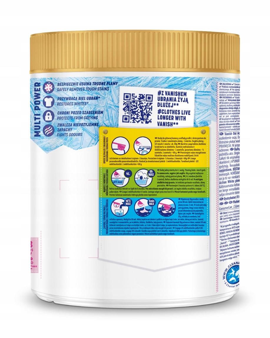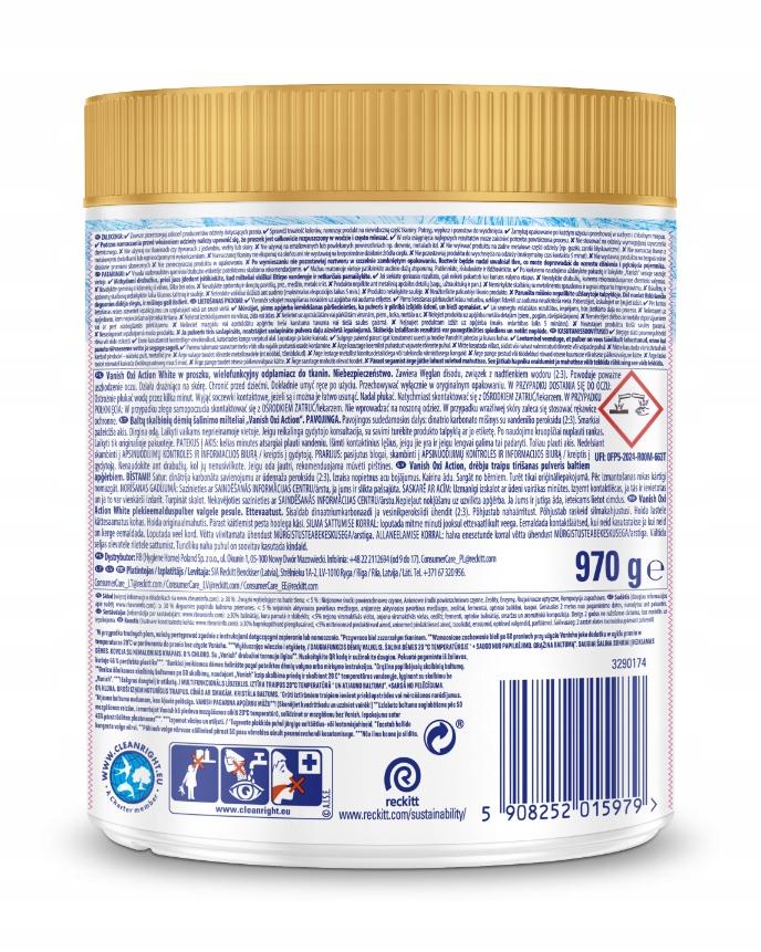 Vanish Oxi Action White w proszku, wielofunkcyjny odplamiacz do tkanin. Niebezpieczeństwo. Zawiera Węglan disodu, związek z nadtlenkiem wodoru (2:3). Działa drażniąco na skórę. Powoduje poważne uszkodzenie oczu. Chronić przed dziećmi. Przechowywać wyłącznie w oryginalnym opakowaniu. Dokładnie umyć ręce po użyciu.