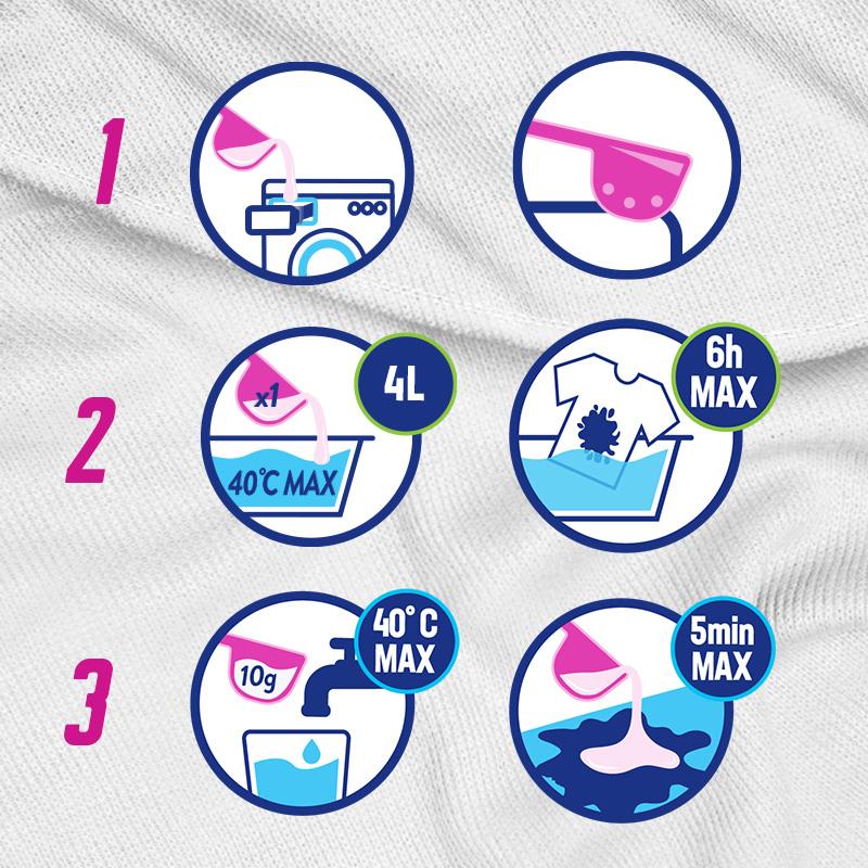 • Namocz białe tkaniny nie dłużej niż 30 minut. Po namoczeniu upierz jak zwykle