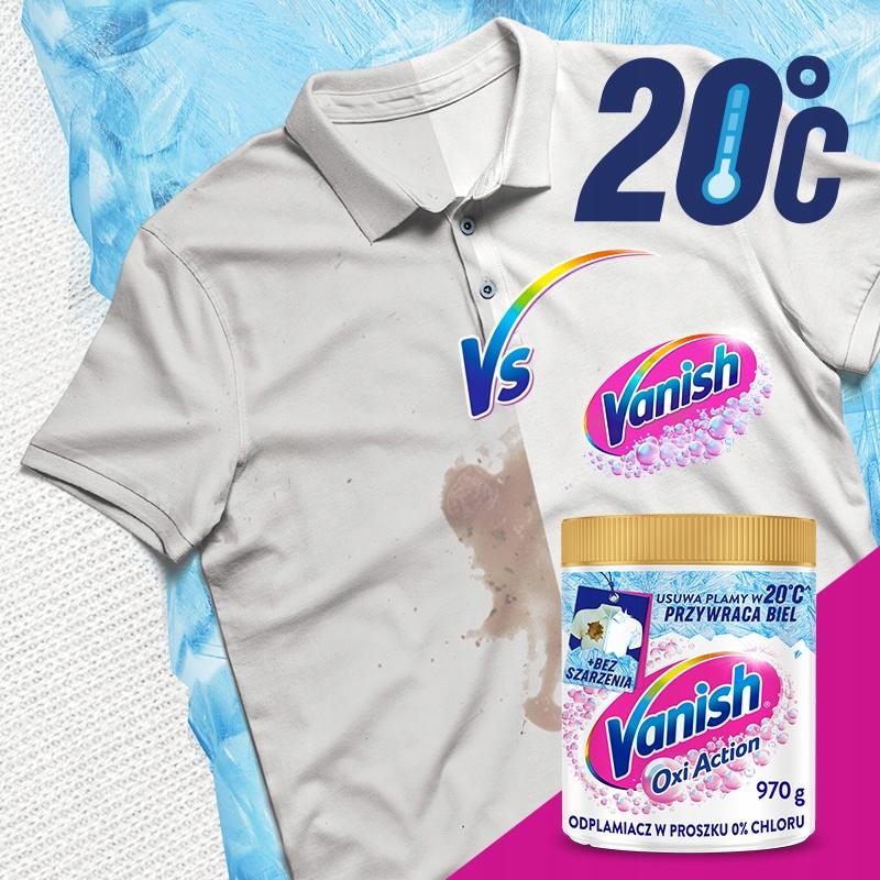 Pranie w gorącej wodzie niszczy tkaniny. Białe ubrania żyją dłużej* gdy pierzesz je w 20°C z nowym Vanishem Oxi Action.