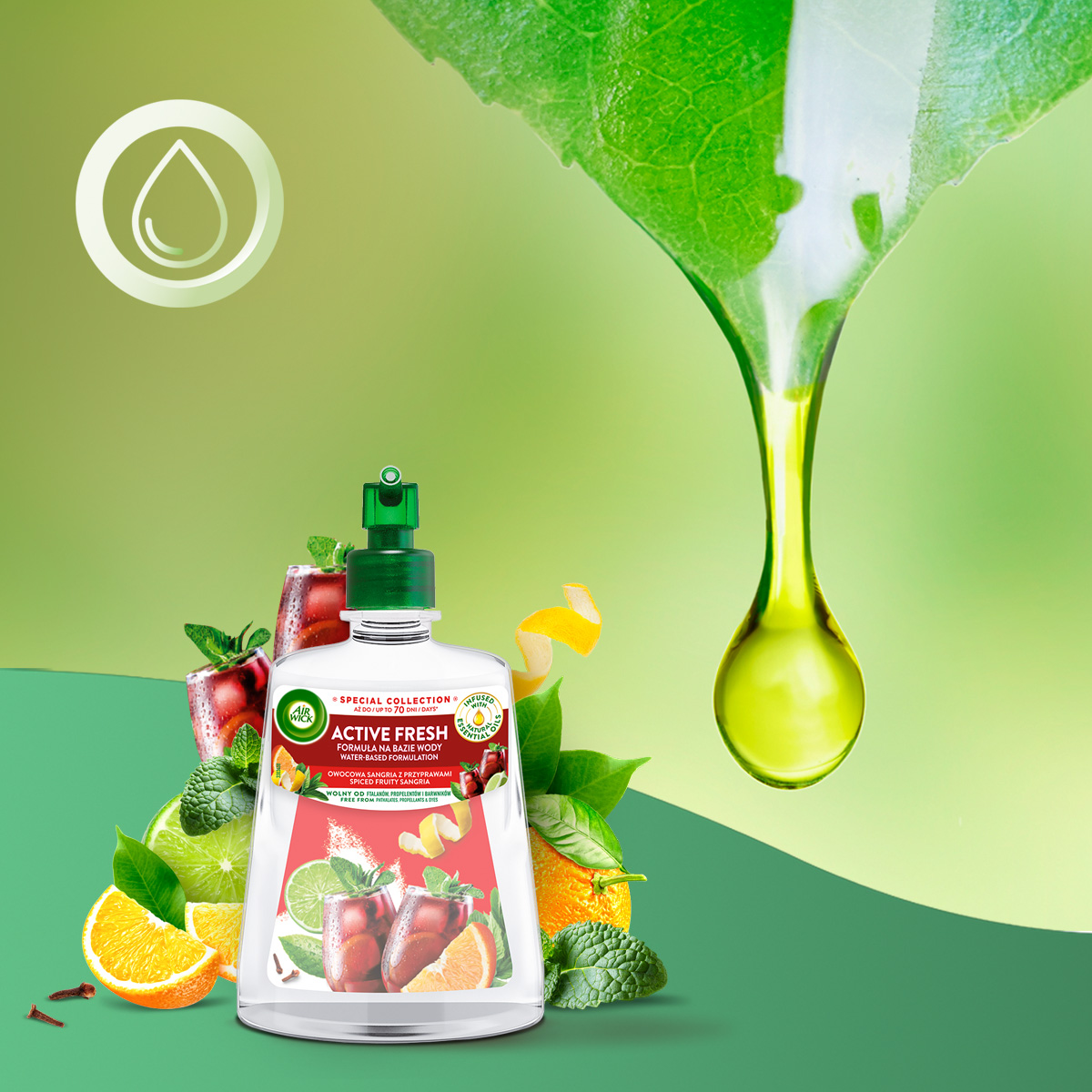 Air Wick 24/7 ACTIVE FRESH to wyjątkowa formuła stworzona ze starannie wyselekcjonowanych składników, którą wzbogaciliśmy o naturalne olejki eteryczne. Zawiera aż 95% składników pochodzenia naturalnego i jest pozbawiona ftalanów, propelentów i barwników. Zaproś do swojego domu zapach niesamowitej świeżości i bądź w kontakcie z naturą!