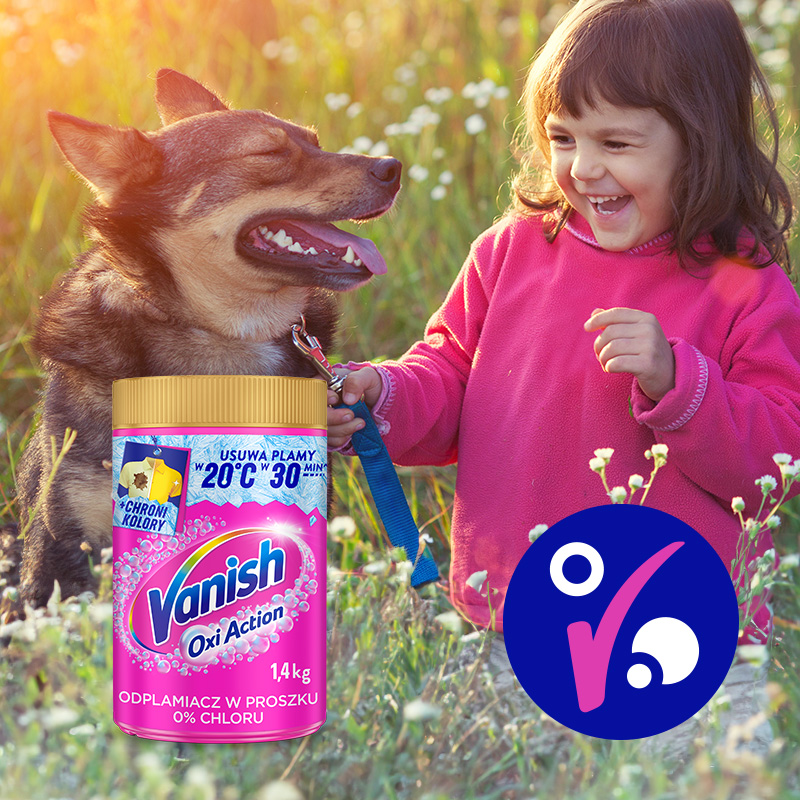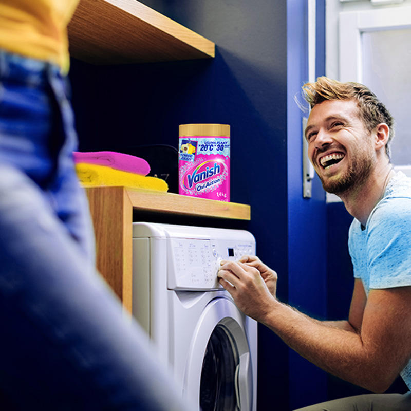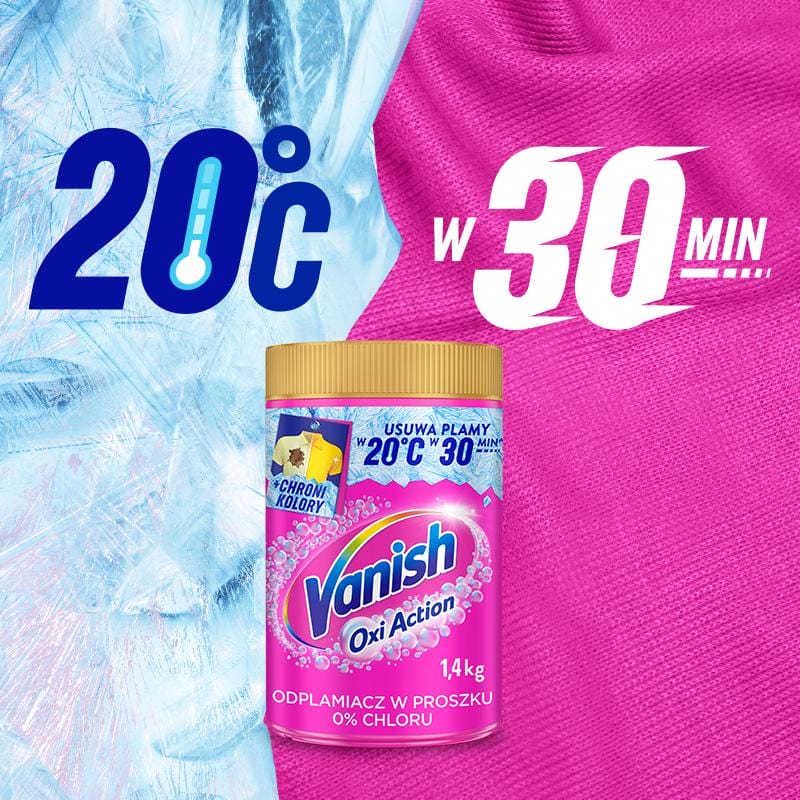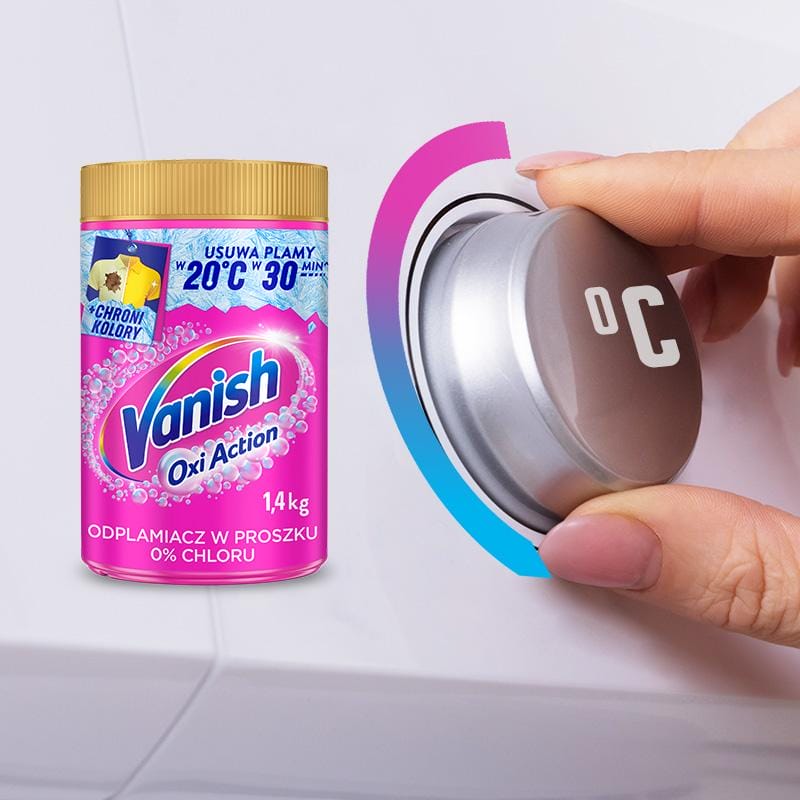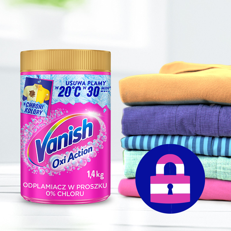 Ubrania żyją dłużej gdy pierzesz je w 20°C w 30-minutowym cyklu z nowym Vanish Oxi Action, który dodatkowo chroni tkaniny przed zafarbowaniem. Dodaj miarkę do każdego prania i ciesz się żywymi kolorami swoich ubrań bez plam i obaw o przebarwienia!