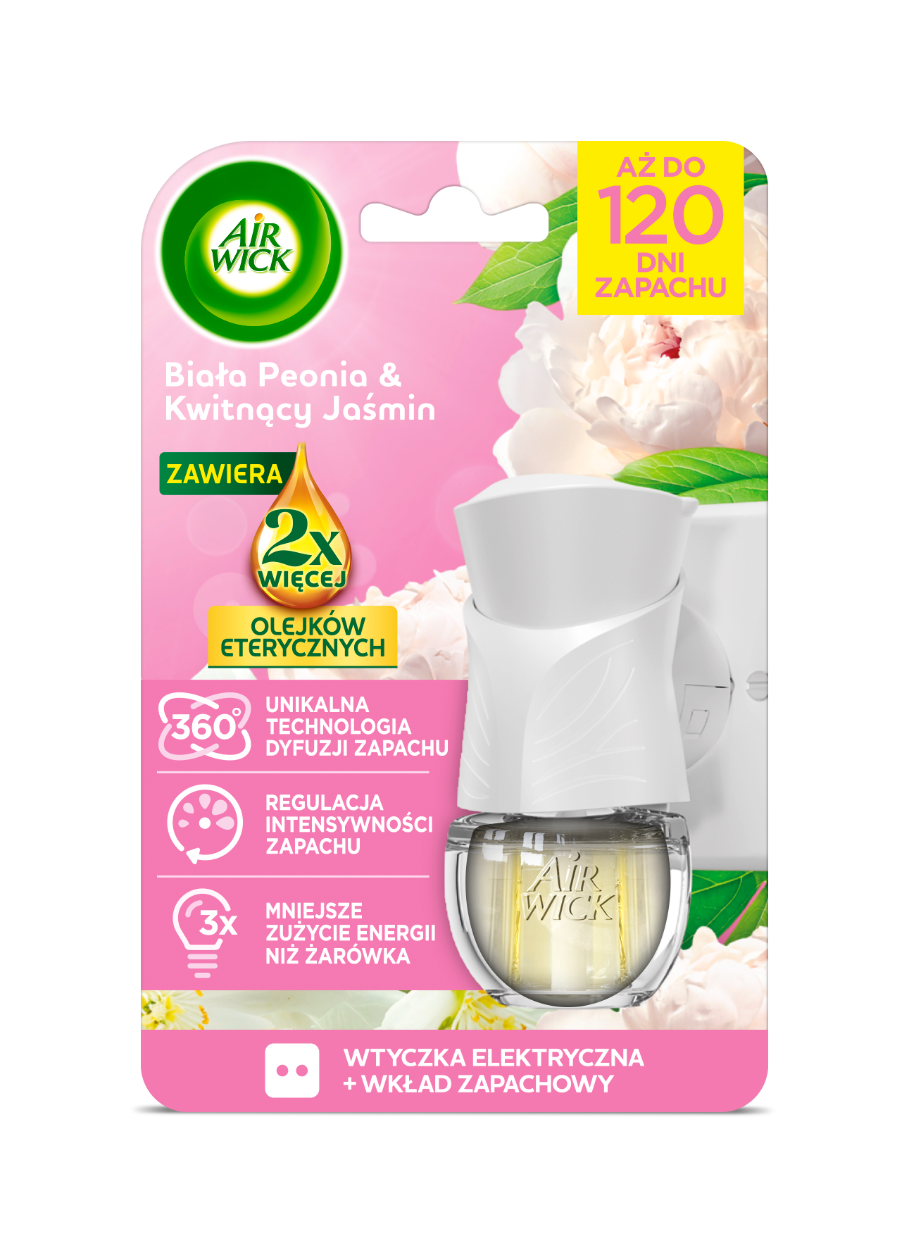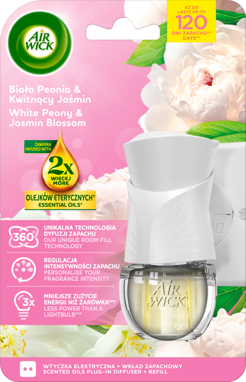 Zrelaksuj się w otoczeniu kwiatowego aromatu dzięki odświeżaczowi powietrza Air Wick z elektryczną wtyczką i wkładem zapachowym o nutach białej peonii i kwitnącego jaśminu. Produkt zawiera aż 2x więcej olejków eterycznych, oferując do 120 dni pięknego zapachu. Dzięki technologii dyfuzji 360°, regulacji intensywności zapachu i energooszczędnej pracy (3x mniejsze zużycie energii niż żarówka), jest to wygodne i stylowe rozwiązanie dla każdego wnętrza.