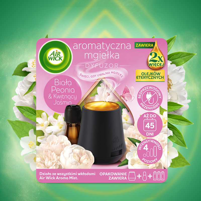 AIR WICK AROMATYCZNA MGIEŁKA O ZAPACHU BIAŁA PEONIA & KWITNĄCY JAŚMIN KOMPLET 20ML Z PODWOJONĄ ZAWARTOŚCIĄ OLEJKÓW ETERYCZNYCH*