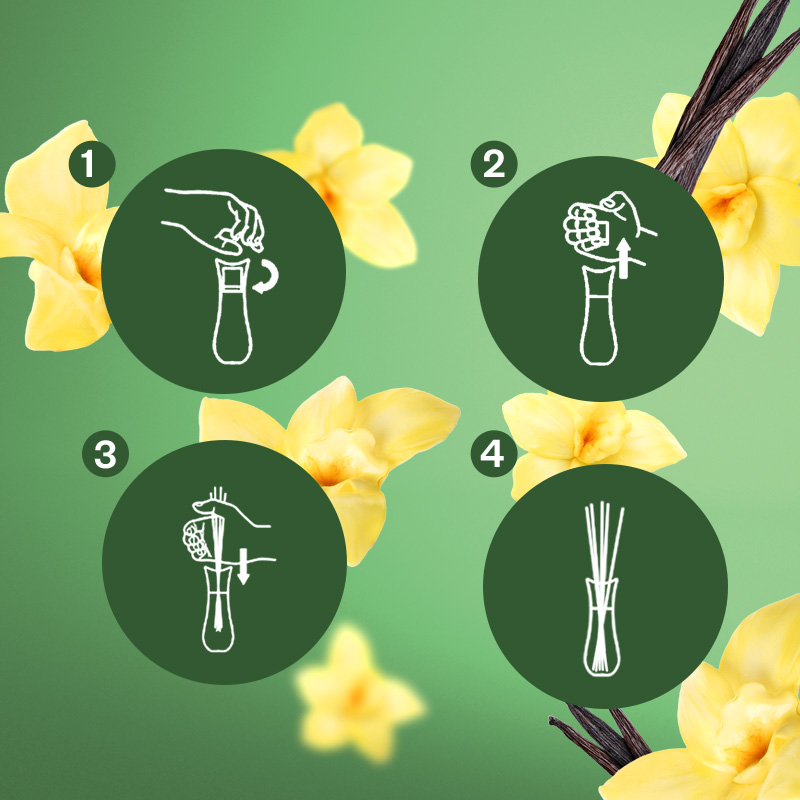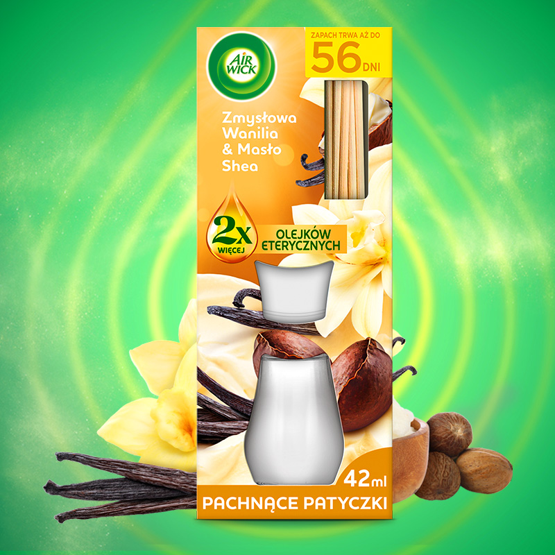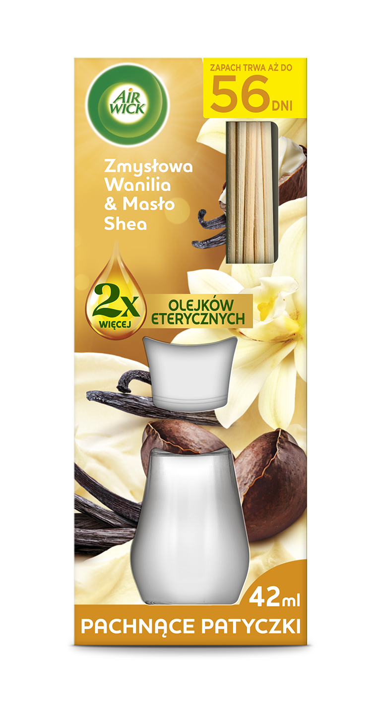 AIR WICK PACHNĄCE PATYCZKI O ZAPACHU ZMYSŁOWA WANILIA & MASŁO SHEA 42ML Z PODWOJONĄ ZAWARTOŚCIĄ OLEJKÓW ETERYCZNYCH*