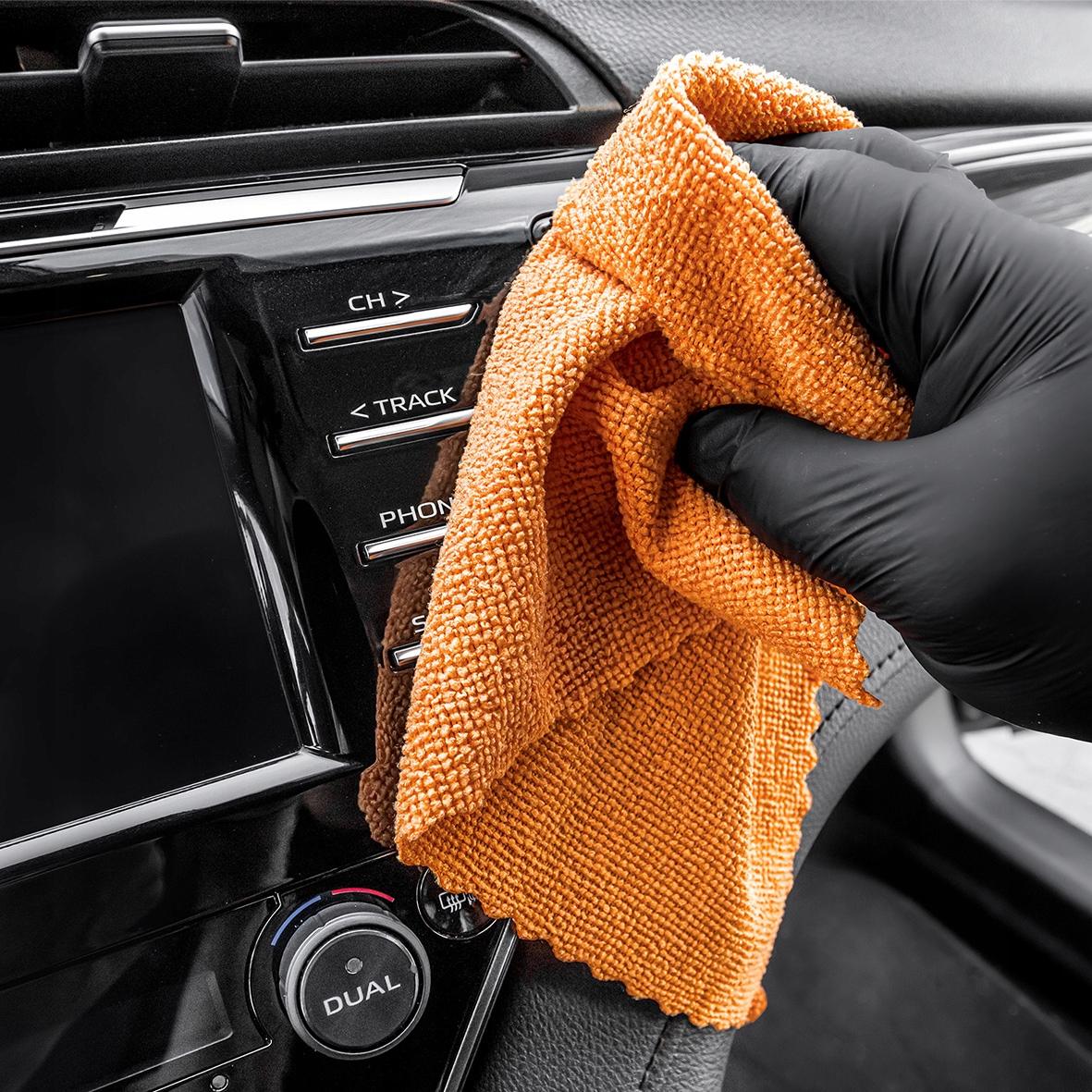 - Użyj ściereczek do detailngu wnętrza – Zestaw ściereczek z mikrofibry ciętych laserowo sprawdzi się przy detailingu wnętrza samochodu. Można je stosować na sucho, jak i na mokro. Dzięki cięciu laserowemu nie ma szwów i jest bezpieczniejsza w użyciu. Wystarczy wyjąć jedną ściereczkę i użyć np. do doczyszczania lub wcierania preparatów konserwujących. Mikrofibra świetnie zbiera zanieczyszczenia, sprawdzi się przy polerowaniu oraz zbieraniu nadmiaru preparatu.