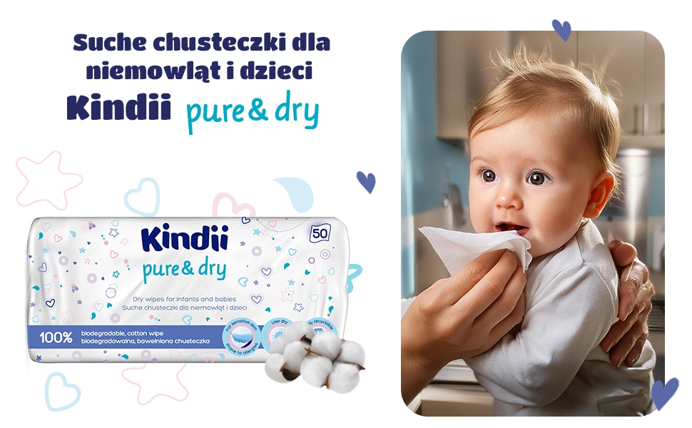 Chusteczki Kindii Pure & Dry聽to nowoczesny produkt, o ograniczonej liczbie sk艂adnik贸w stworzony do wyj膮tkowo聽delikatnego oczyszczania聽i聽piel臋gnacji wra偶liwej聽sk贸ry niemowl膮t i dzieci od pierwszych dni 偶ycia. Specjalnie opracowana, pozbawiona kompozycji zapachowej receptura, zawiera surowce pochodzenia naturalnego.聽Delikatna聽i聽mi臋kka聽chusteczka聽skutecznie oczyszcza.聽Produkt przebadany dermatologicznie, o pH neutralnym dla sk贸ry, bez kompozycji zapachowej.