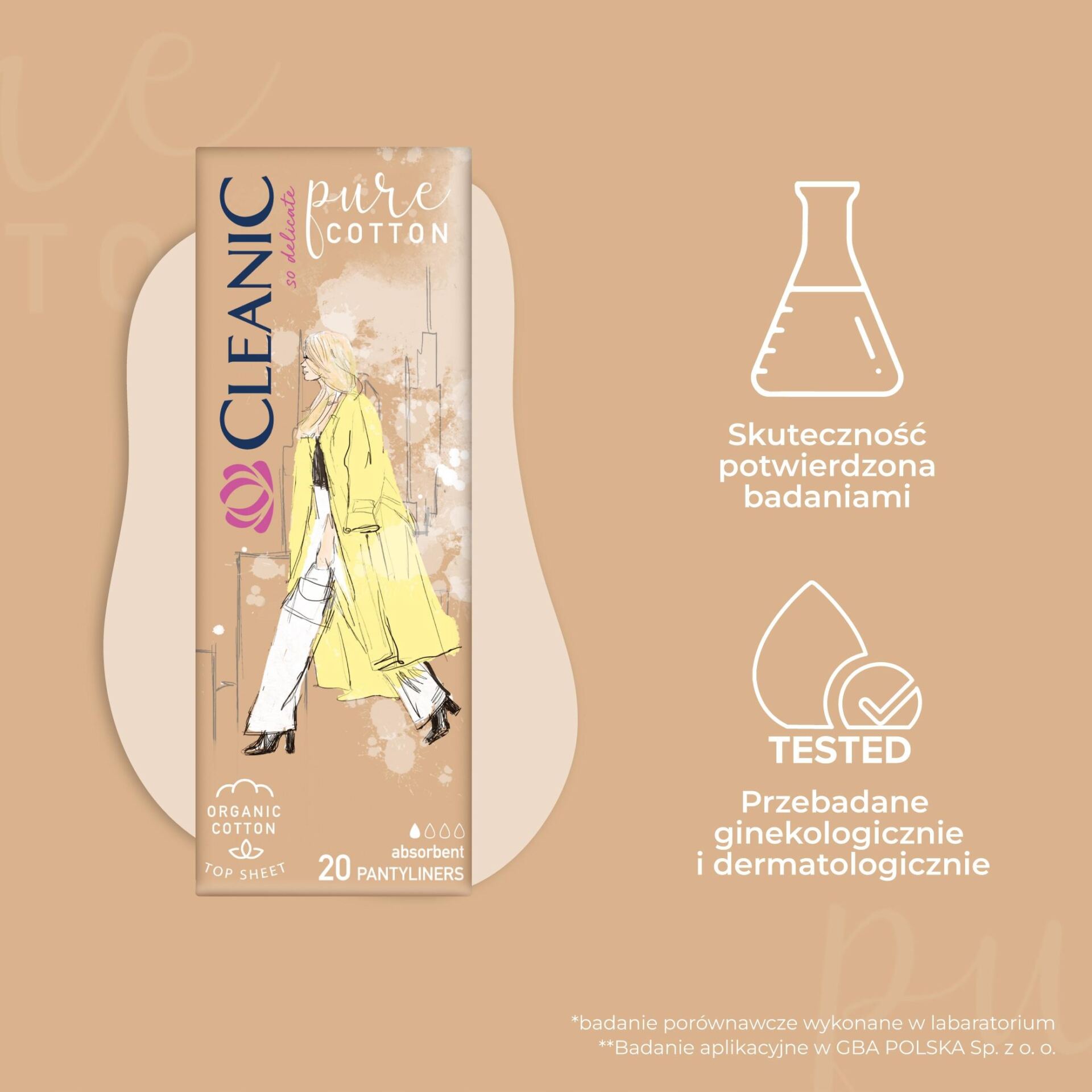 Wkładki Cleanic Pure Cotton to naturalne rozwiązanie dla skóry wrażliwej i skłonnej do podrażnień. Wierzchnia warstwa wkładki wykonana jest w 100% z bawełny organicznej. Naturalny, bawełniany absorbent doskonale zatrzymuje wilgoć, zapewniając uczucie czystości i świeżości. Naturalna warstwa wierzchnia jest delikatna dla skóry i nie powoduje podrażnień. Wkładki Cleanic Pure Cotton są wyjątkowo miękkie, cienkie oraz doskonale dopasowane. Wkładki Cleanic Pure Cotton zostały przetestowane ginekologicznie i dermatologiczne oraz posiadają certyfikat VEGAN, aby zapewnić najwyższe standardy bezpieczeństwa i jakości.