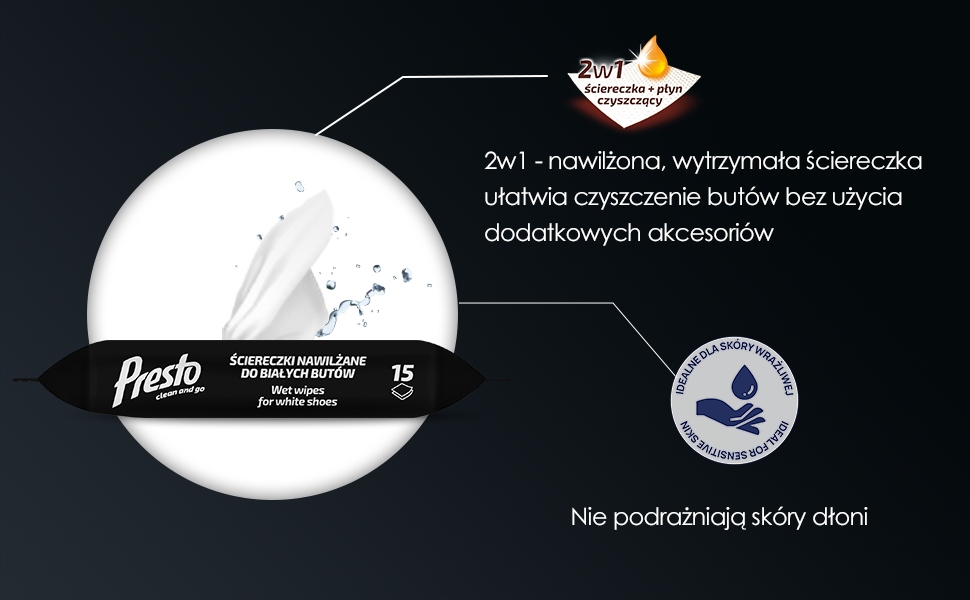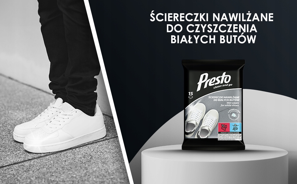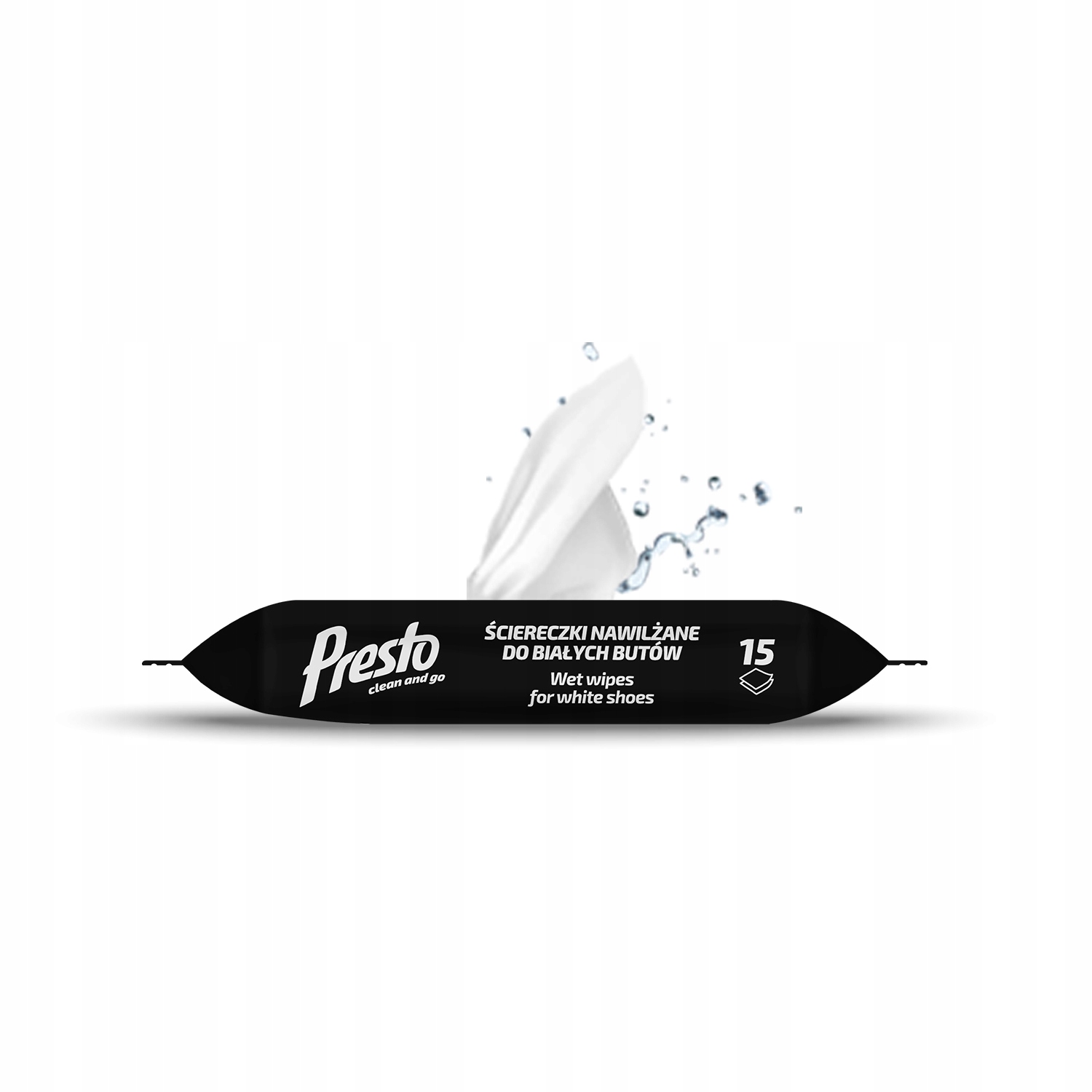 Odkryj sekret nieskazitelnej bieli butów. Presto nawilżane ściereczki do czyszczenia białych butów przywracają biel i odświeżają kolor, nadając obuwiu nowy blask. Skutecznie usuwają najbardziej uporczywe plamy i brud z różnych materiałów, w tym z gumowej podeszwy. Nawilżane ściereczki Presto są niezbędnym narzędziem do pielęgnacji Twojego obuwia, bez użycia dodatkowych akcesoriów.Delikatna formuła sprawia, że ściereczki nie podrażniają skóry dłoni. Dzięki kompaktowemu opakowaniu możesz mieć je zawsze przy sobie i korzystać z nich nawet w podróży.