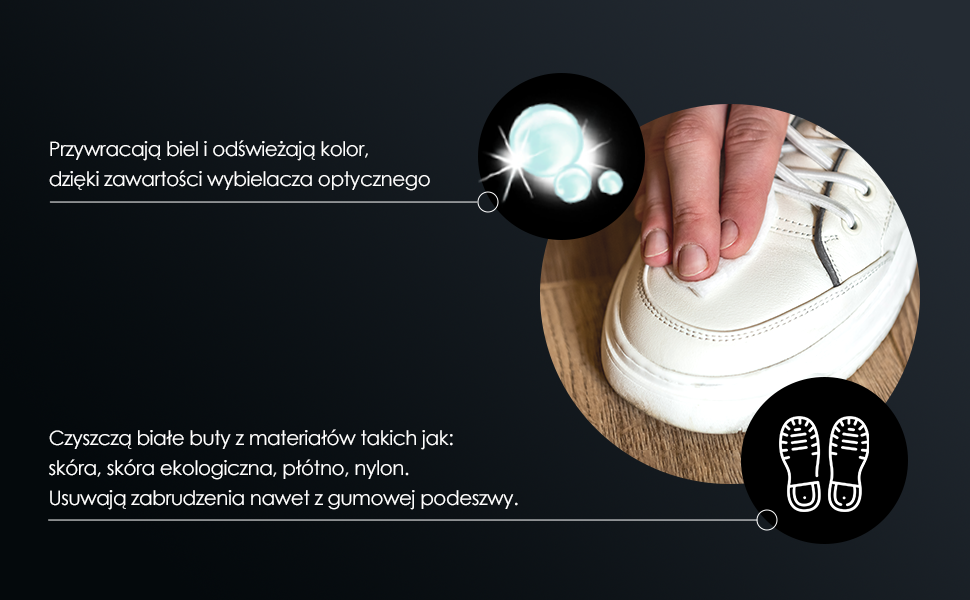 • Efekt odświeżenia: Dzięki optycznemu, wybielaczowi chusteczki nie tylko usuwają brud, ale także nadają butom biel i odświeżają ich kolor, przywracając pierwotny blask i świeżość.