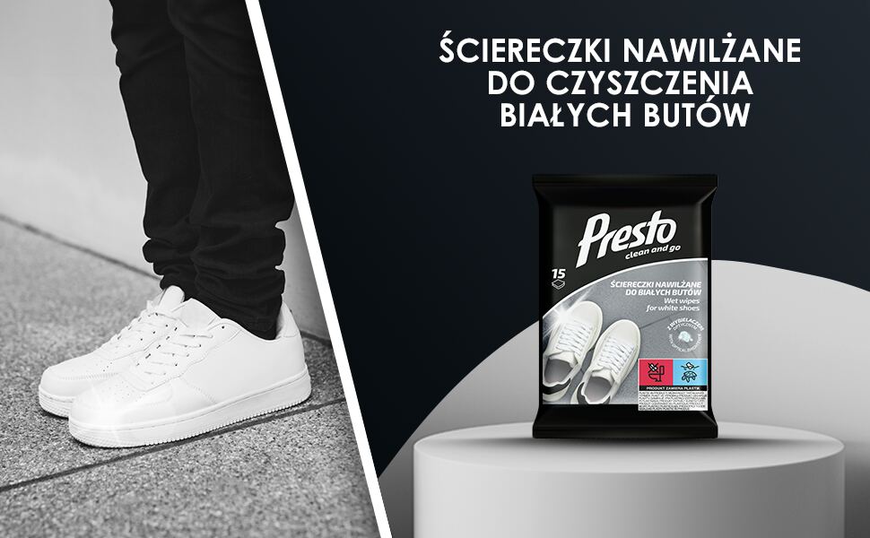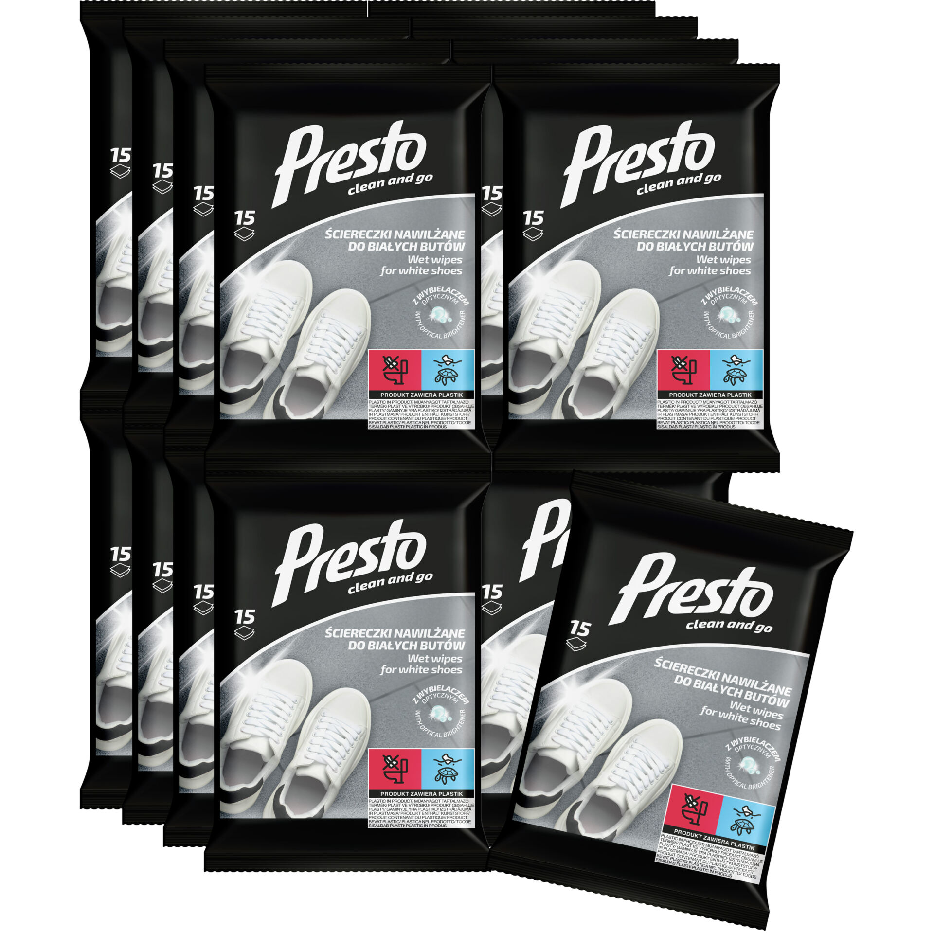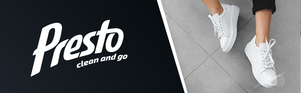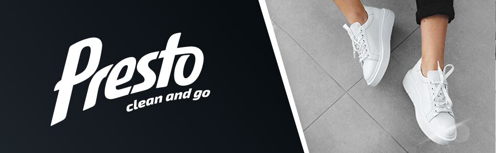 • Niezawodny produkt: Nawilżane ściereczki Presto to niezbędny produkt do pielęgnacji białego obuwia, wykonanego z materiałów, takich jak skóra, skóra ekologiczna, płótno i nylon. Niezależnie od rodzaju materiału, ściereczki skutecznie usuwają wszelkie zabrudzenia, nawet z gumowej podeszwy.