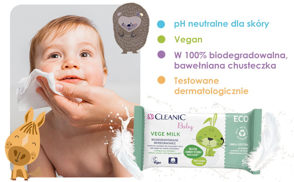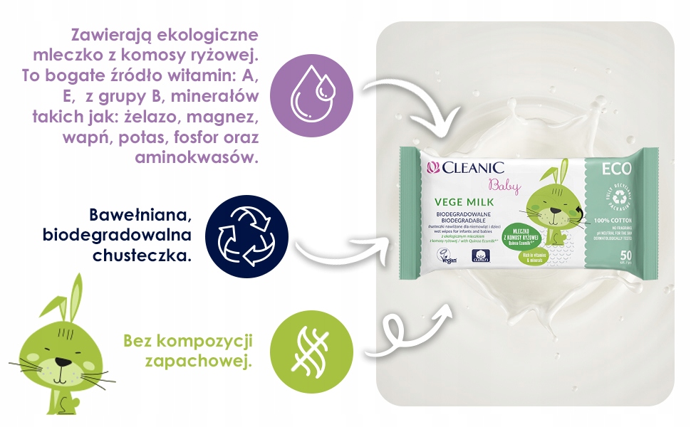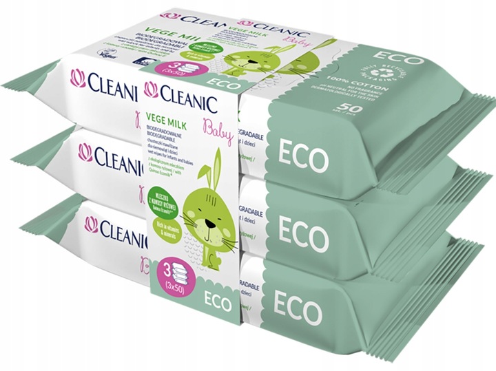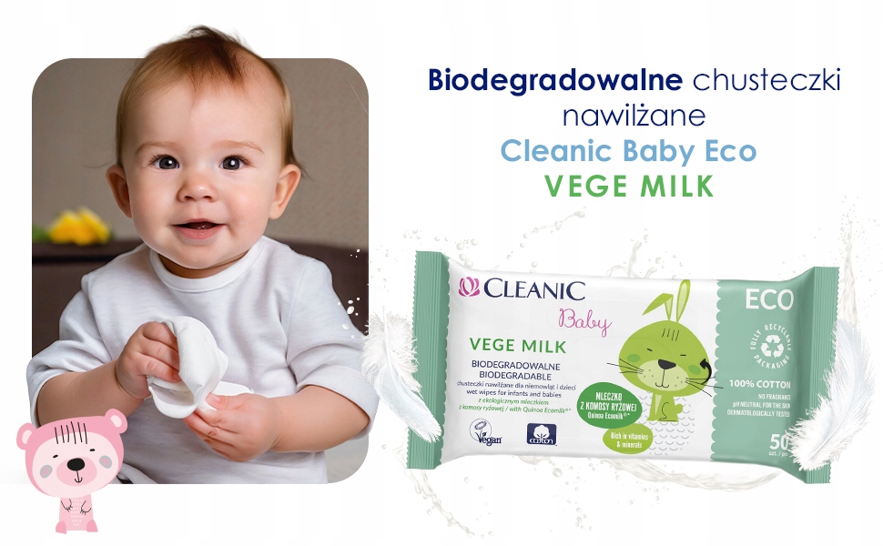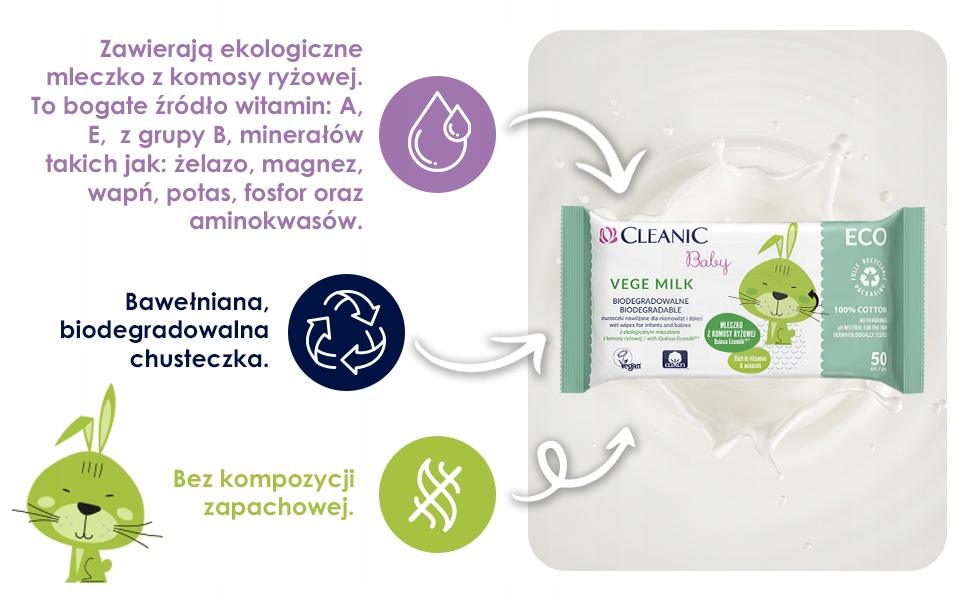 Certyfikowane chusteczki nawilżane Cleanic Baby ECO Vege Milk przeznaczone są do oczyszczania i pielęgnacji wrażliwej skóry niemowląt i dzieci. Formuła chusteczek została wzbogacona mleczko z komosy ryżowej pochodzące z ekologicznych upraw, gdzie nie stosuję się nawozów sztucznych i pestycydów. Co ważne, mleczko z komosy ryżowej jest bogatym źródłem witamin: A, E,  z grupy B, minerałów takich jak: żelazo, magnez, wapń, potas, fosfor oraz aminokwasów. Bawełniana chusteczka jest biodegradowalna zaś opakowanie nadaje się do recyklingu.