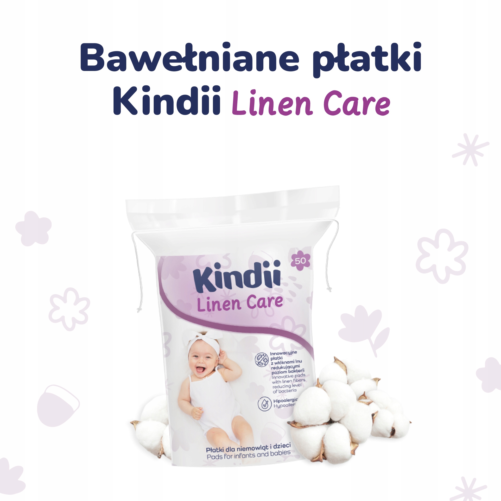 Płatki Kindii Linen Care to niezastąpiony element codziennej pielęgnacji delikatnej skóry niemowląt i dzieci. Z myślą o bezpieczeństwie i komforcie najmłodszych, zostały wykonane z miękkiej bawełny z dodatkiem lnu, która nie podrażnia skóry, a zawartość włókien lnu redukuje poziom bakterii*.