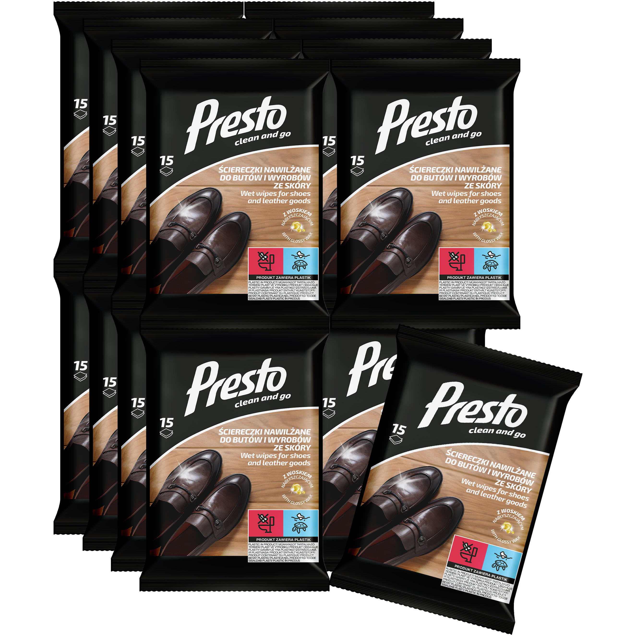 16 x Presto Ściereczki nawilżane z woskiem nabłyszczającym do butów i wyrobów ze skóry 15 sztuk
