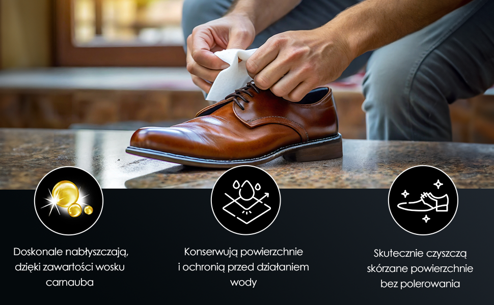 • Ochrona przed wodą: Zawarty w ściereczkach wosk carnauba, znany ze swoich właściwości hydrofobowych, skutecznie chroni skórzane powierzchnie przed wodą i wilgocią oraz sprawia, że buty pozostaną w świetnym stanie nawet w trudnych warunkach pogodowych.