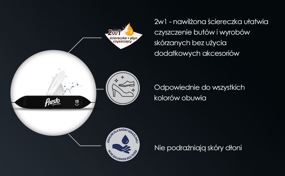 Innowacyjne ściereczki PRESTO dzięki zawartości wosku carnauba nabłyszczają, konserwują skórzane powierzchnie i chronią przed działaniem wody. Ściereczki czyszczą skutecznie bez konieczności polerowania. Sprawdzą się do czyszczenia skórzanego obuwia oraz innych wyrobów ze skóry np. torebek, neseserów, portfeli, pasków.