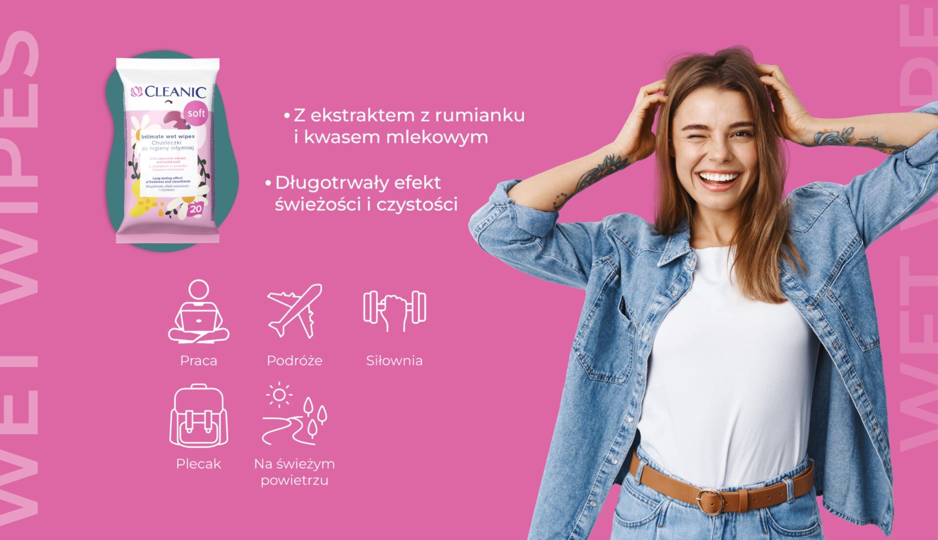 • Chusteczki Cleanic Soft charakteryzuje nietuzinkowe, nowoczesne i kolorowe opakowanie