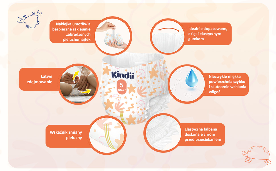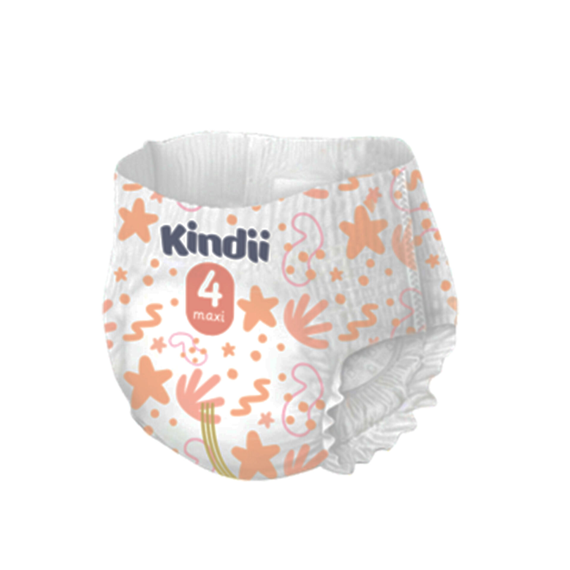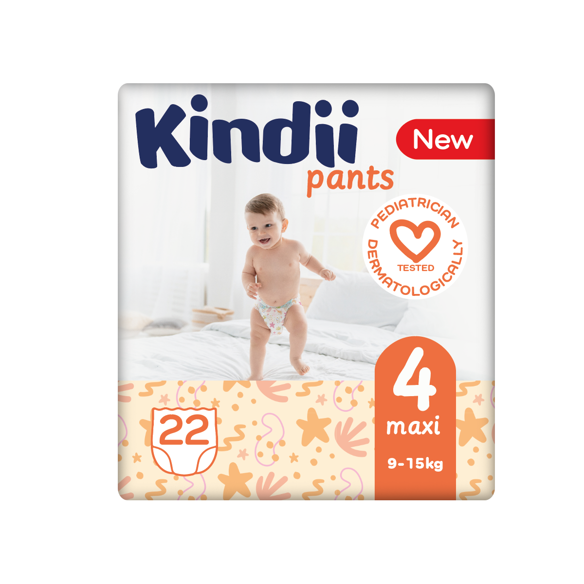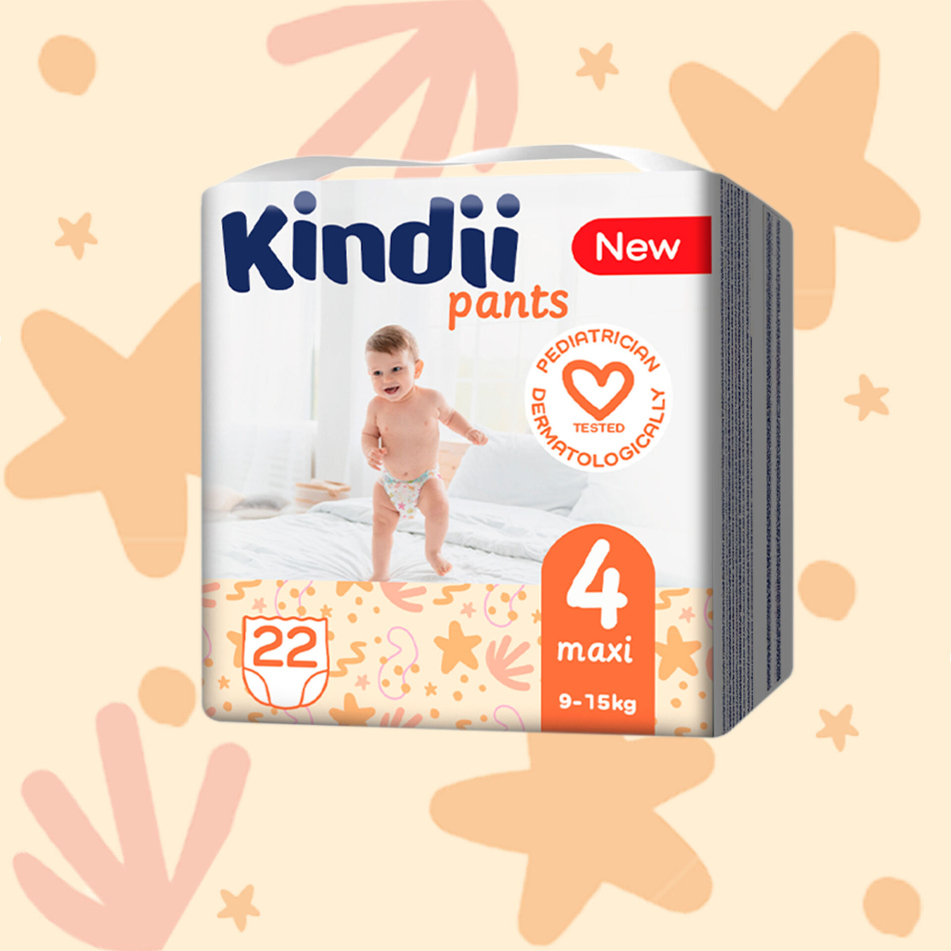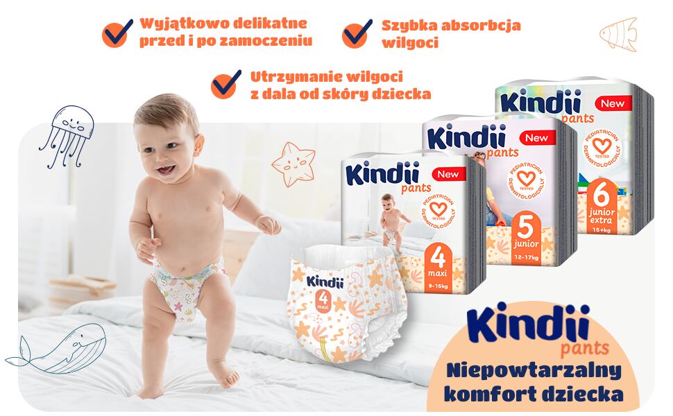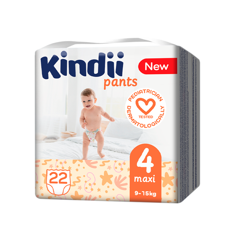 Kindii Pants zapewniają komfort i bezpieczeństwo Twojemu dziecku. Dzięki zastosowaniu innowacyjnych technologii, pieluszki są lekkie, miękkie, oddychające oraz nie podrażniają wrażliwej skóry malucha. Pieluchomajtki Kindii dostępne są w rozmiarach 4, 5, 6. Idealne do stosowania zarówno w dzień, jak i w nocy.