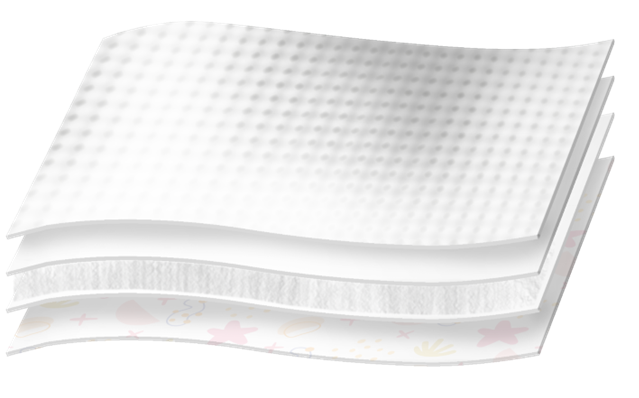 • Miękka warstwa wewnętrzna: Wykonana z włókniny w technologii Hot-Air, warstwa wewnętrzna szybko przenosi wilgoć do warstwy chłonnej. To oddychająca warstwa z tłoczeniami 3D, które zapewniają punktowy kontakt ze skórą dziecka, tym samym minimalizując ryzyko podrażnień.