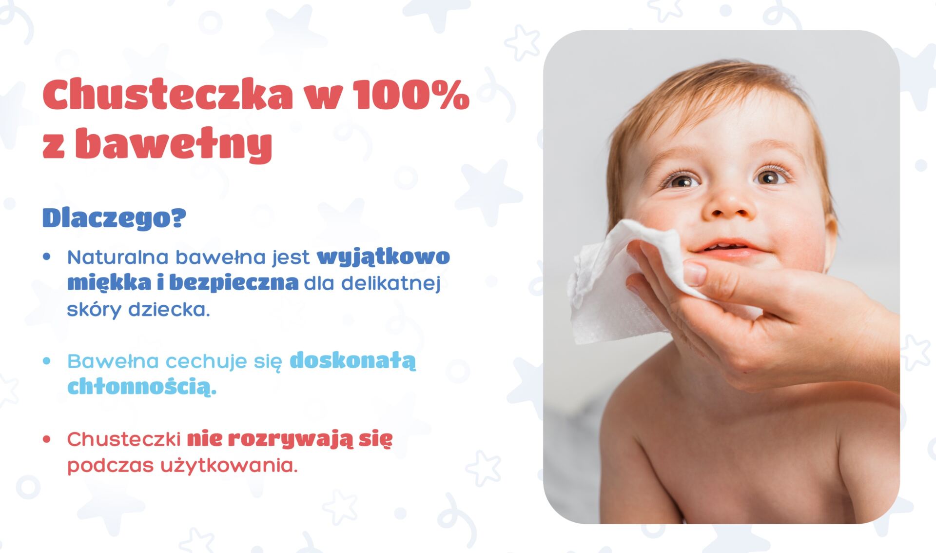 • W 100% bawełniana, miękka chusteczka: Wykonane z bawełny – wyjątkowo miękkiej i przyjaznej dla delikatnej skóry dziecka. Nie powodują podrażnień i zapewniają komfort przy każdym użyciu.