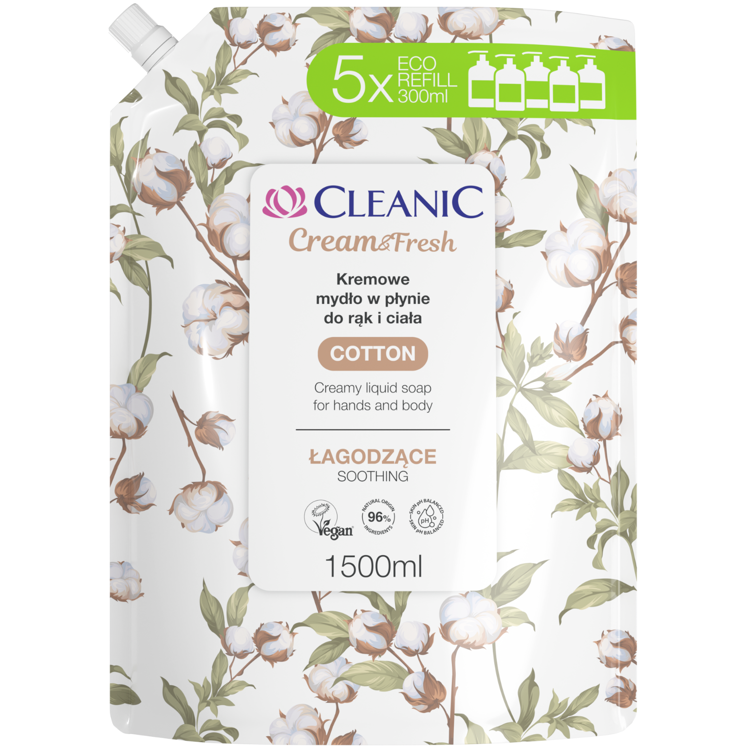 Cleanic Cream & Fresh Cotton, łagodzące kremowe mydło w płynie do rąk i ciała, 1500 ml
