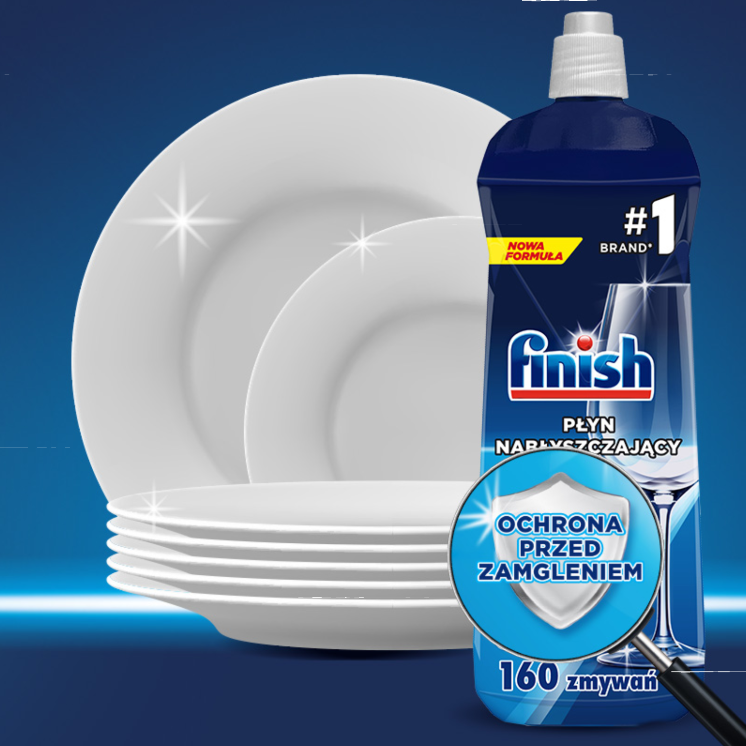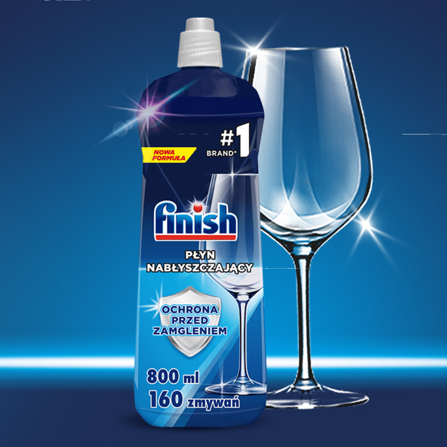 Finish płyn nabłyszczający zapewnia 100% lepsze efekty schnięcia* oraz zapobiega powstawaniu zacieków na Twoich naczyniach i szkle. Jego formuła o wzmocnionych właściwościach ochronnych szkła, chroni je przed zamgleniem**, zapewniając długotrwały olśniewający blask.