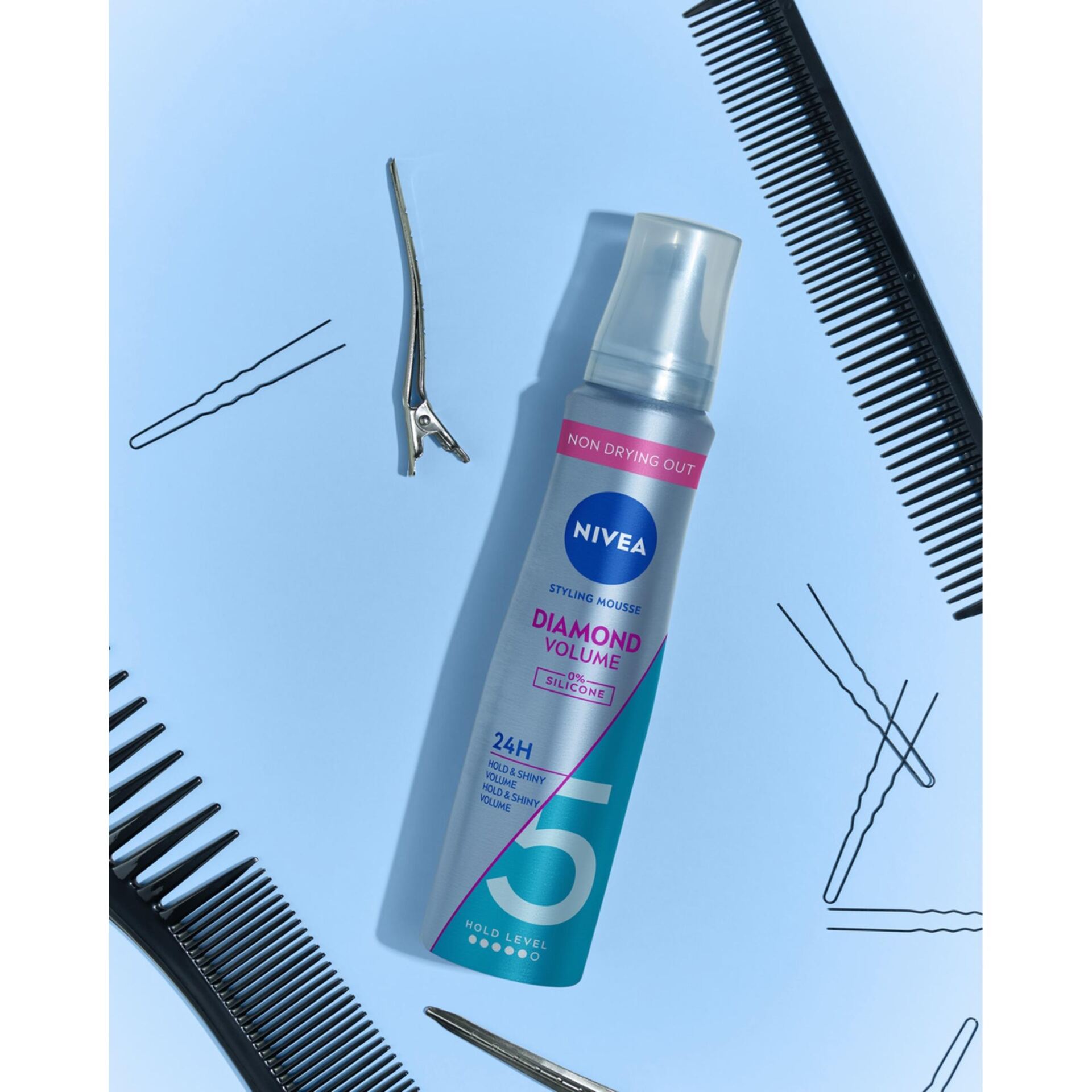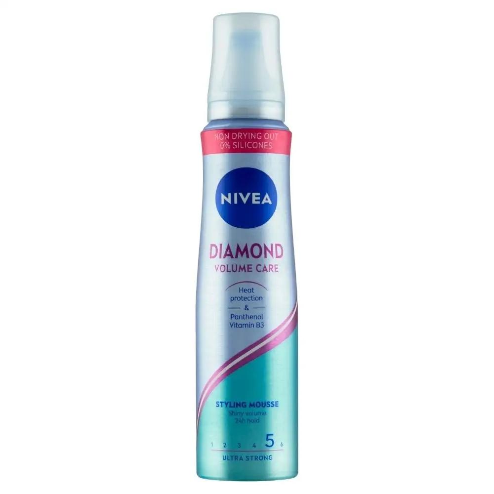 Ulepszona formuła pianka do włosów NIVEA Diamond Volume Care z pantenolem i witaminą B3 wzmacnia i chroni Twoje włosy. Pianka NIVEA Volume przeznaczona jest do włosów matowych lub cienkich, pozbawionych blasku, zapewnia im elastyczne utrwalenie nawet do 24 godzin. Pianka aktywnie pielęgnuje włosy, nie sklejając ich, a także wzmacnia włosy zapewniając objętość pełną diamentowego blasku. Pianka NIVEA chroni przed działaniem wysokiej temperatury. Pamiętaj, aby dbać o dobrą kondycję włosów, stosując produkty do pielęgnacji przeznaczone do Twojego rodzaju włosów.