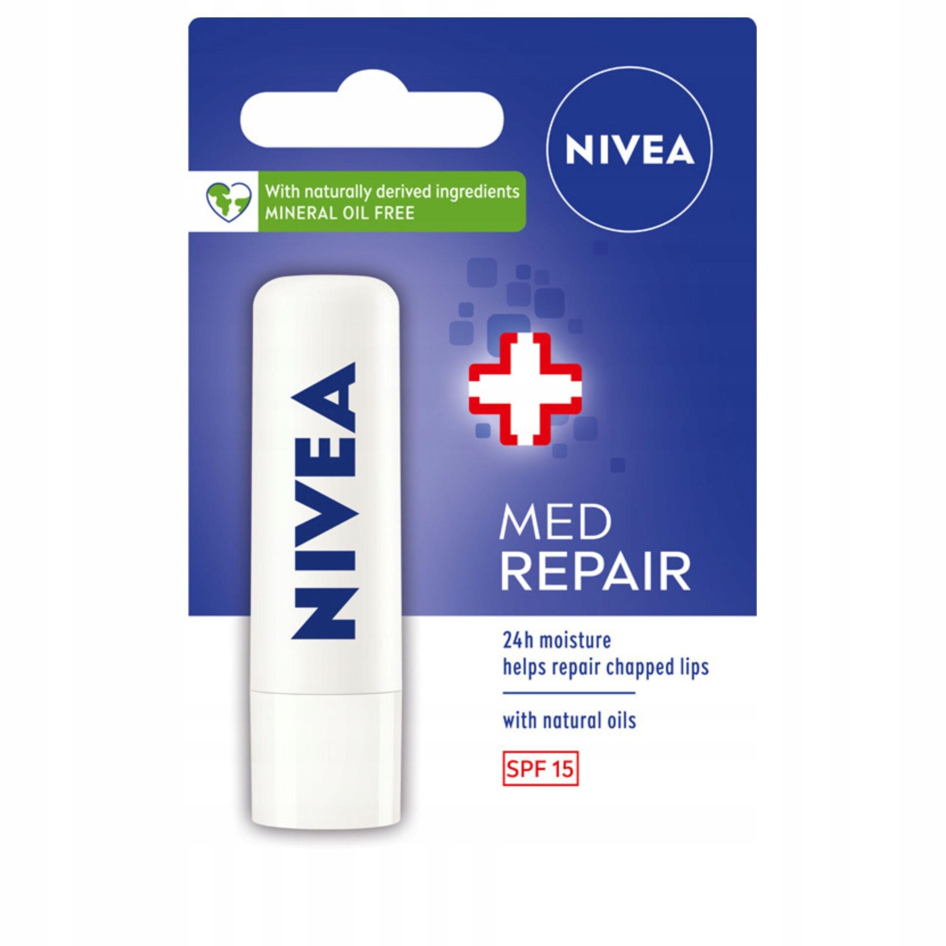 Zapewnij ukojenie swoim suchym i spierzchniętym ustom z pomadką NIVEA Med Repair! Pielęgnująca formuła z naturalnymi olejkami i witaminą E nawilża wargi oraz łagodzi uczucie szczypania i pieczenia w przypadku spierzchniętych ust. Natychmiast wtapia się w usta, wspomagając ich regenerację i dostarczając im 24h nawilżenia*. Regenerująca pomadka zawiera także filtr przeciwsłoneczny SPF 15, aby chronić Twoje usta przed szkodliwym wpływem promieni UV. Nałóż pomadkę ochronną Med Repair kiedy tylko Twoje usta potrzebują ukojenia, nawilżenia i pomocy w regeneracji!