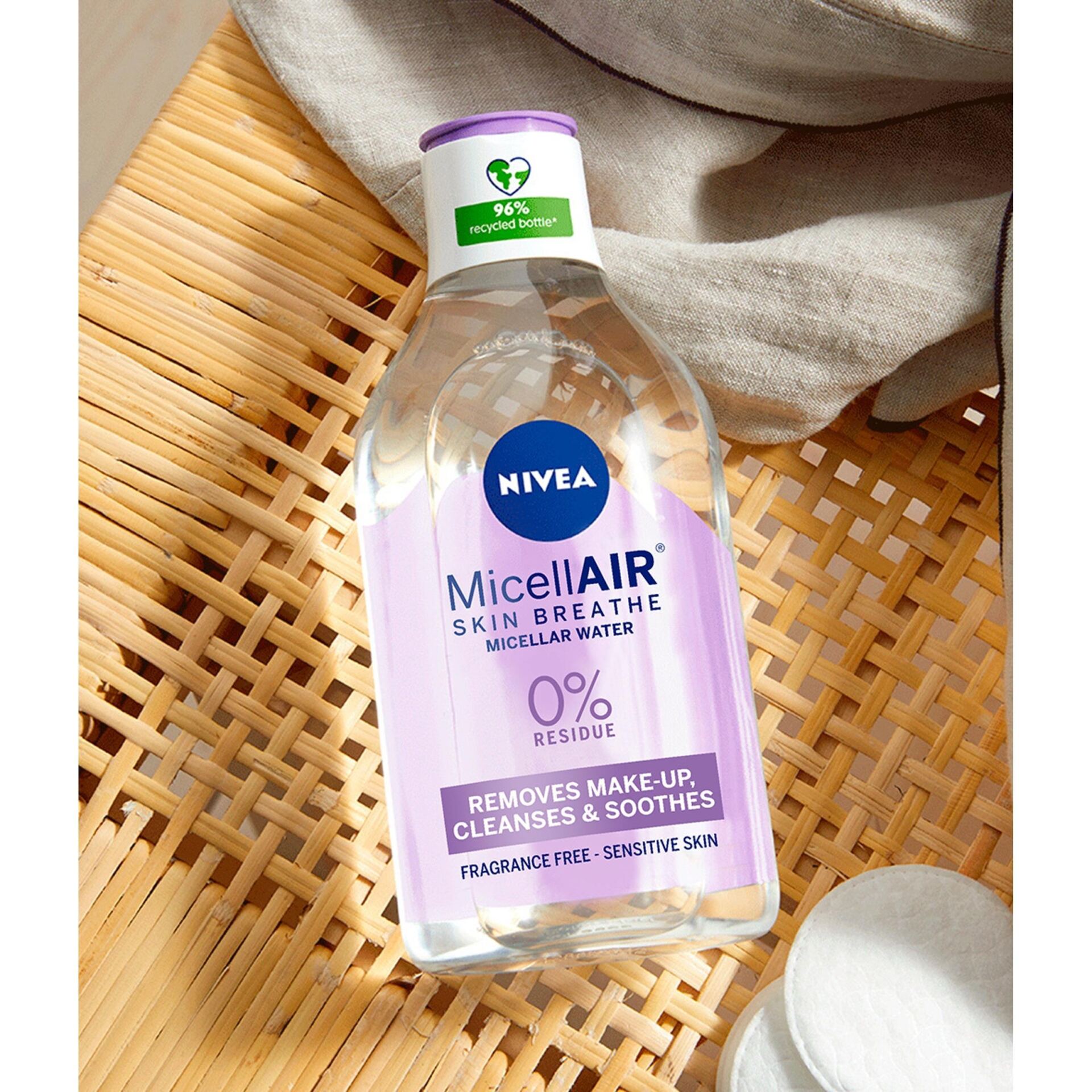 Specjalnie opracowany dla skóry wrażliwej Kojący Płyn Micelarny NIVEA usuwa makijaż, oczyszcza, nawilża i koi skórę bez pozostawiania śladów. Łagodząca formuła wody micelarnej NIVEA z Kompleksem Aminokwasowym i Dekspantenolem jest wzbogacona o oczyszczające micele i łagodne aminokwasy. Płyn do demakijażu skutecznie usuwa makijaż, zanieczyszczenia i brud za pomocą kilku lekkich pociągnięć, bez konieczności pocierania. Nasza woda micelarna nie zawiera kompozycji zapachowej i jest testowana dermatologicznie i okulistycznie.