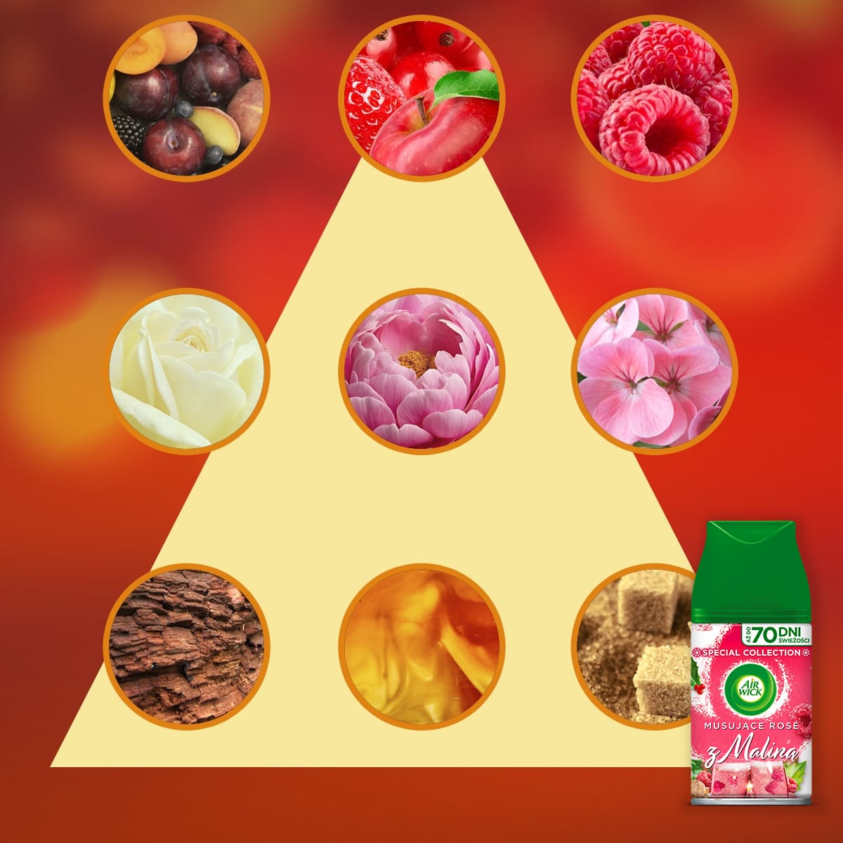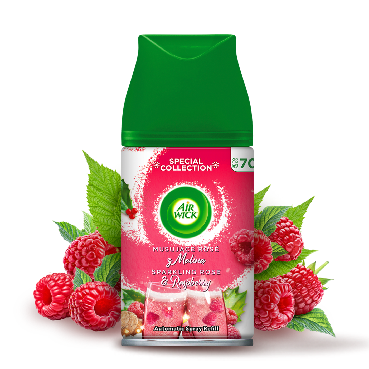 Ożyw swoje wnętrze aromatem delikatnego różowego wina i nutami soczystych malin. Elektryczny odświeżacz powietrza Musujące Rosè z Malinami to wyjątkowe połączenie słodkości i elegancji