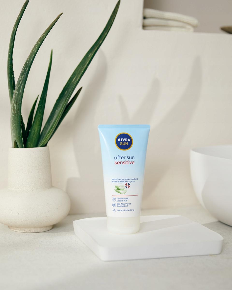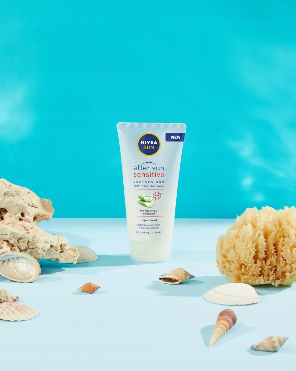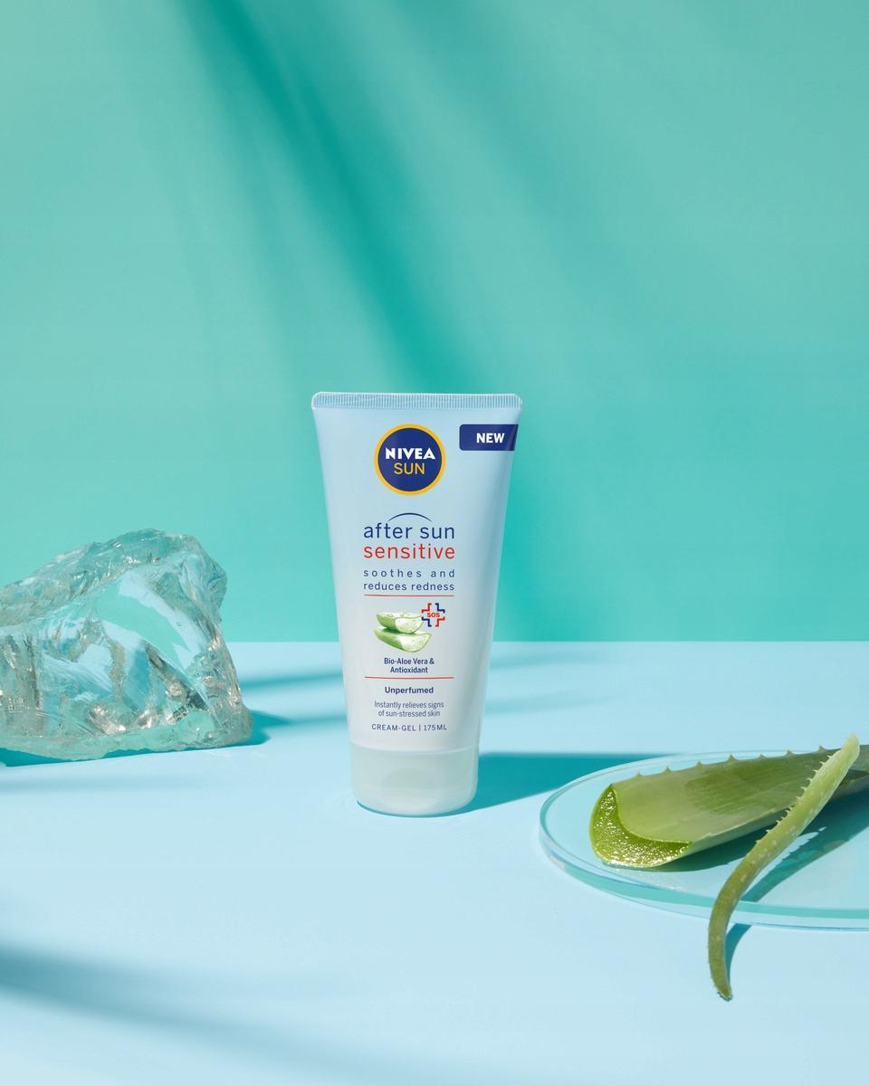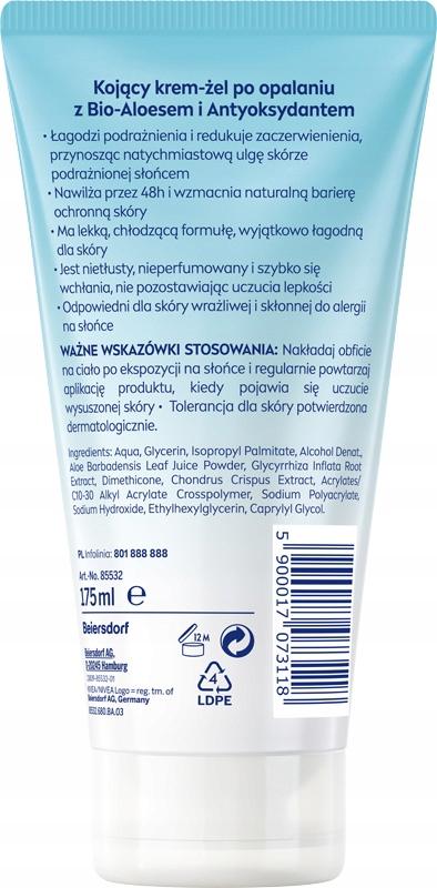 NIVEA SUN After Sun Sensitive Kojący krem-żel po opalaniu natychmiastowo redukuje oznaki podrażnionej słońcem skóry. Jest odpowiedni do skóry wrażliwej i skłonnej do alergii na słońce. Dzięki kojącej i łagodzącej formule z Bio-Aloesem i przeciwutleniaczem natychmiast łagodzi podrażnienia i zmniejsza zaczerwienienia, przynosząc ulgę skórze podrażnionej słońcem. Produkt nawilża przez 48 godzin i wzmacnia naturalną barierę ochronną skóry. Dodatkowo ma lekką konsystencję, wyjątkowo łagodną dla skóry. Jest nieperfumowany, nietłusty i natychmiast się wchłania, nie pozostawiając uczucia lepkości.