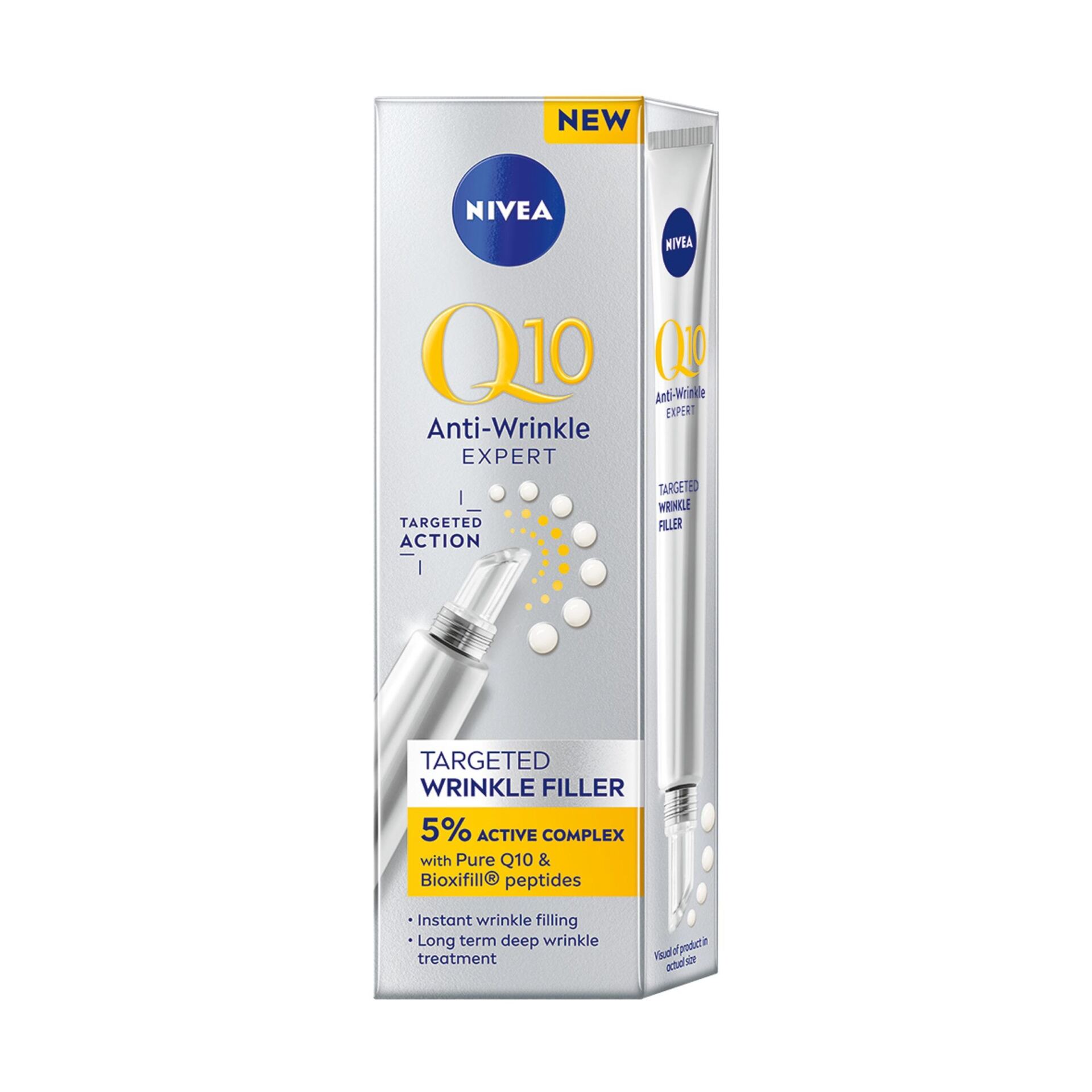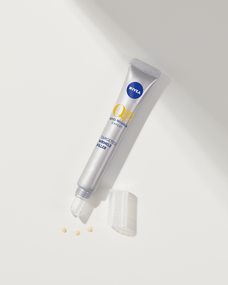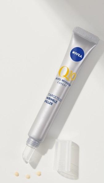 NIVEA Q10 Precyzyjny wypełniacz zmarszczek. Szybko wchłaniająca się formuła zawiera Czysty Koenzym Q10 i Peptydy Bioxifill.