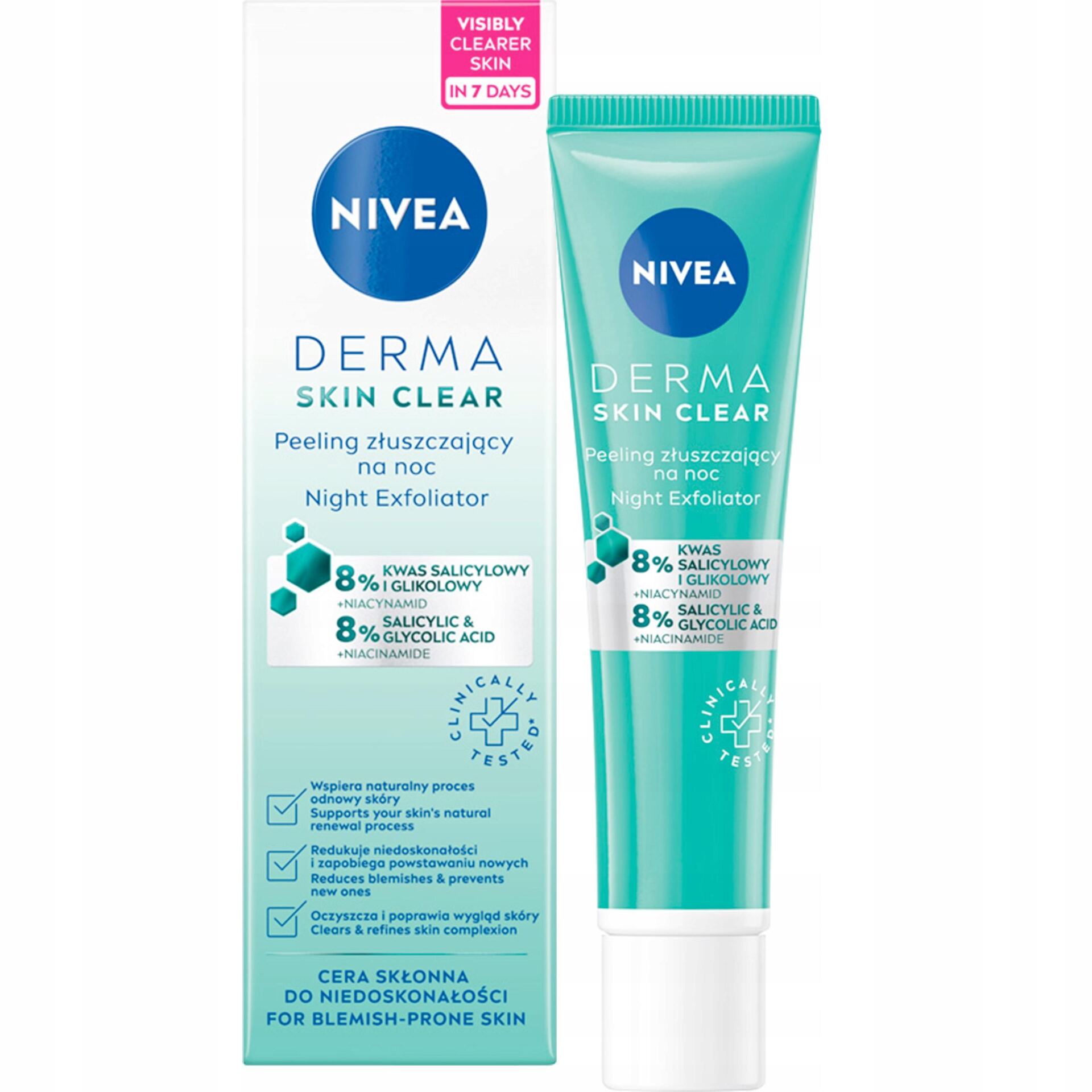 NIVEA Derma Skin Clear Peeling złuszczający na noc zawiera wysoce skoncentrowaną formułę z 8% AHA/BHA (Kwasem Salicylowym i Kwasem Glikolowym) oraz Niacynamidem. Produkt przeznaczony dla cery skłonnej do niedoskonałości. Wspiera naturalny proces odnowy skóry. Oczyszcza cerę już w 7 dni i poprawia jej wygląd. Widocznie redukuje niedoskonałości i zapobiega powstawaniu nowych. Skuteczność potwierdzona klinicznie* Wegańska formuła – bez składników pochodzenia zwierzęcego *Tolerancja i skuteczność dla skóry skłonnej do niedoskonałości przetestowana klinicznie.