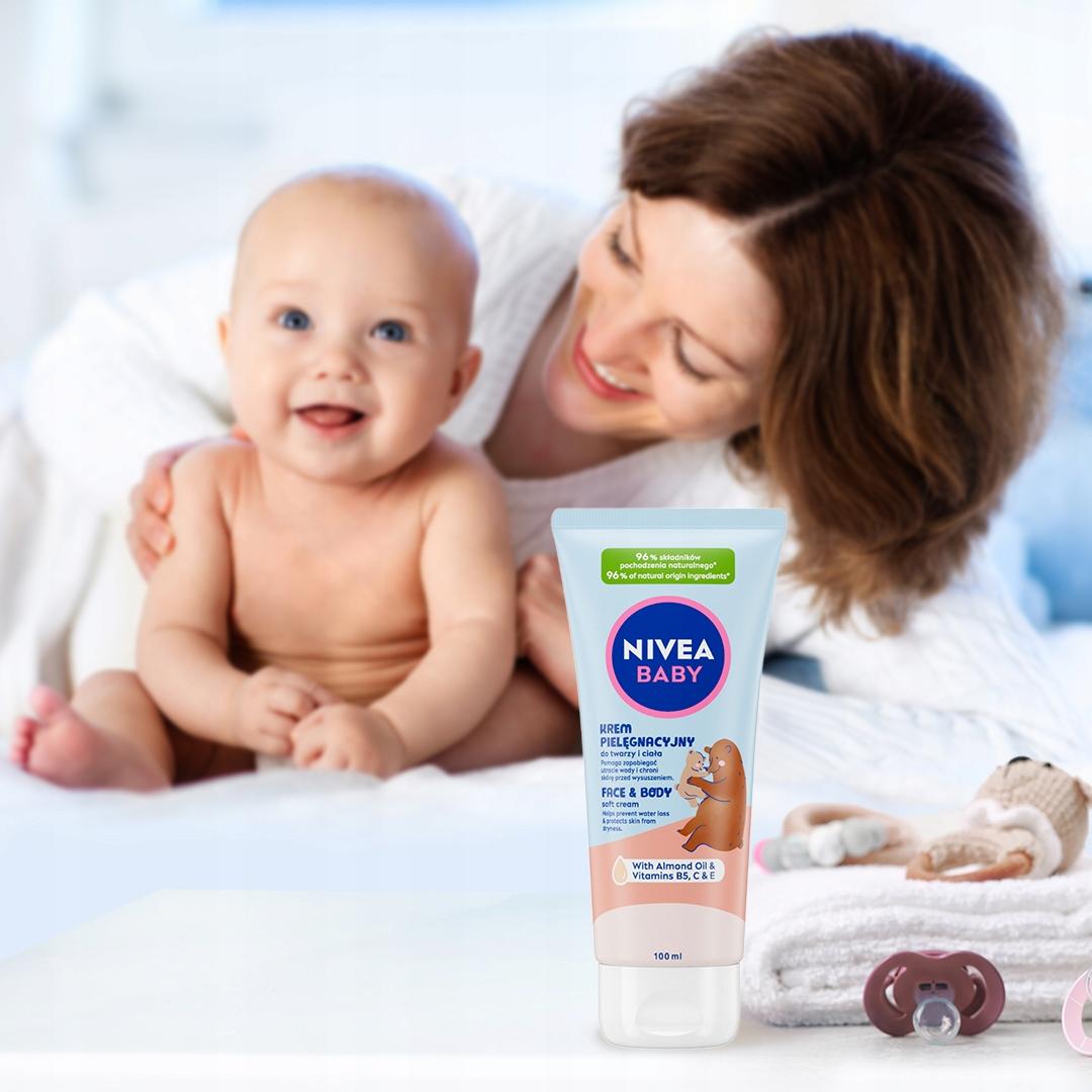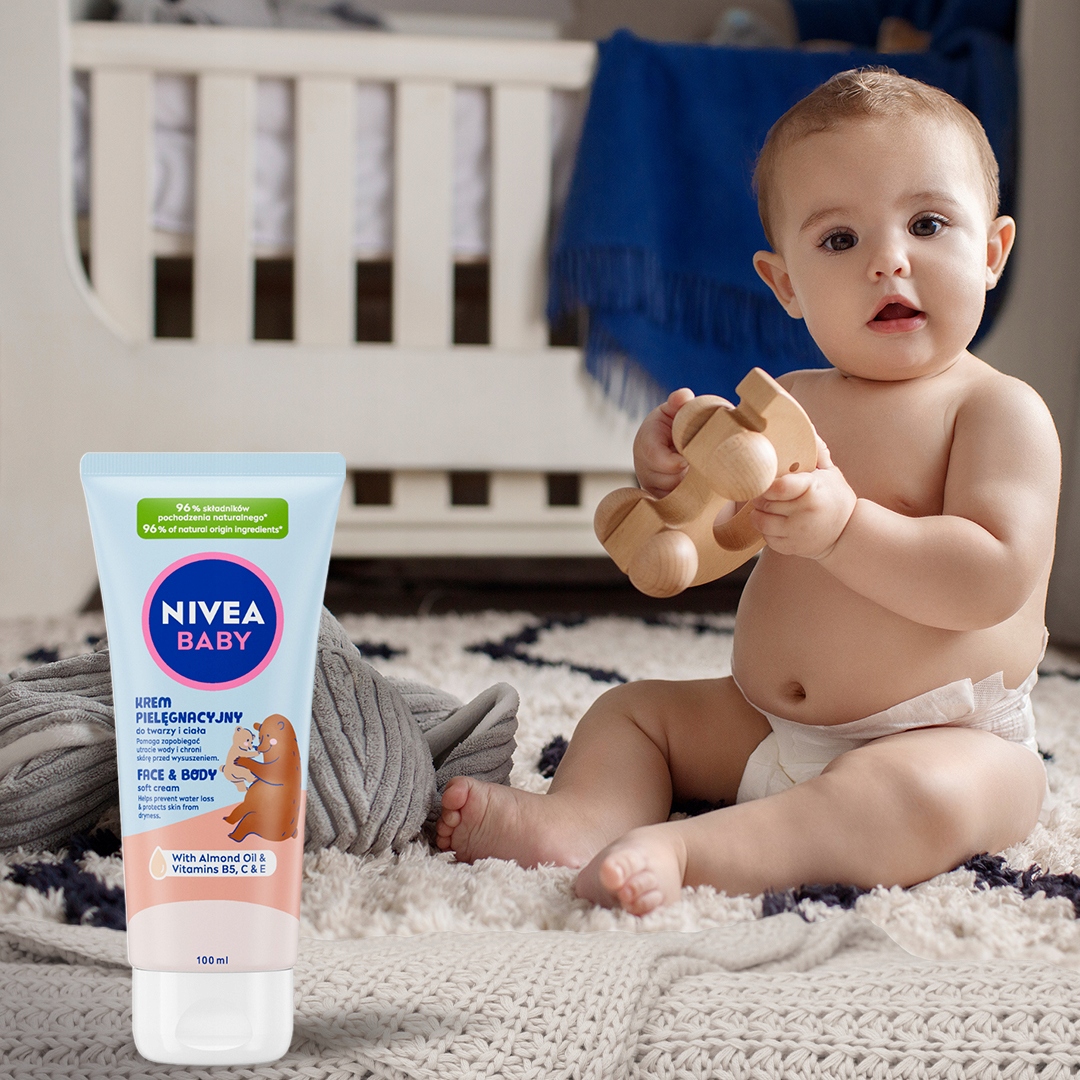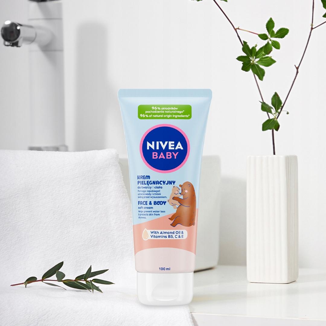 Odkryj nowość od NIVEA BABY Krem Pielęgnacyjny do twarzy i ciała, który nie tylko pomaga zapobiegać utracie wody, chroniąc skórę przed wysuszeniem, ale także chroni i wzmacnia skórę dziecka, wspierając jej naturalny proces rozwoju od 1. dnia życia. Zawiera w 100% naturalny olejek migdałowy i witaminy B5, C i E. Stworzony tak, aby minimalizować ryzyko alergii**.