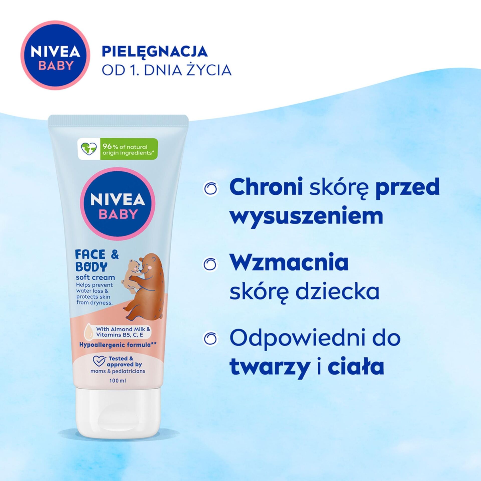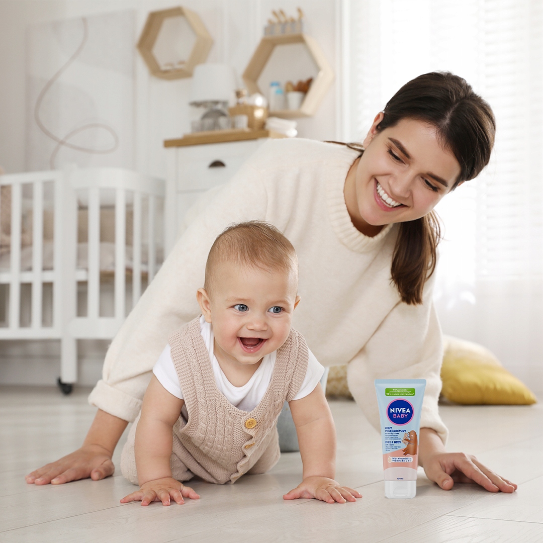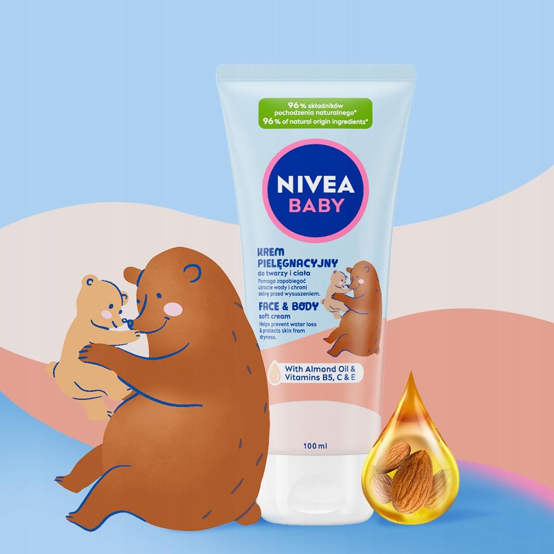 Odkryj nowość od NIVEA BABY Krem Pielęgnacyjny do twarzy i ciała, który nie tylko pomaga zapobiegać utracie wody, chroniąc skórę przed wysuszeniem, ale także chroni i wzmacnia skórę dziecka, wspierając jej naturalny proces rozwoju od 1. dnia życia. Zawiera w 100% naturalny olejek migdałowy i witaminy B5, C i E. Stworzony tak, aby minimalizować ryzyko alergii**.