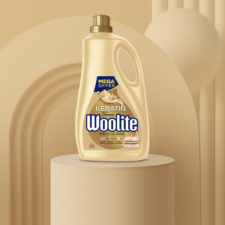 Woolite to jedyny na rynku płyn z keratyną, słynącą z wyjątkowych właściwości pielęgnacyjnych włosów. Keratyna dba o nie i regeneruje, wykazując świetne właściwości ochronne, nawilżające i wygładzające. Z tego względu jest chętnie wykorzystywana przez największych światowych producentów kosmetyków do pielęgnacji włosów.