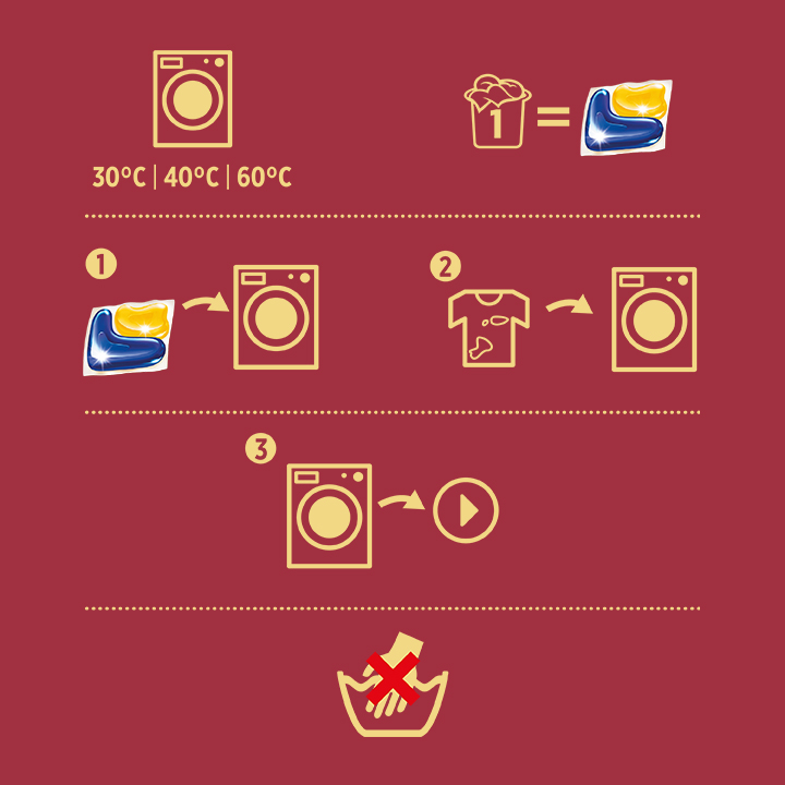 Umieść jedną kapsułkę w pustym bębnie pralki przed jej załadowaniem. Nie umieszczaj kapsułki bezpośrednio w szufladce na detergent. Nie dotykaj kapsułki mokrymi rękami.