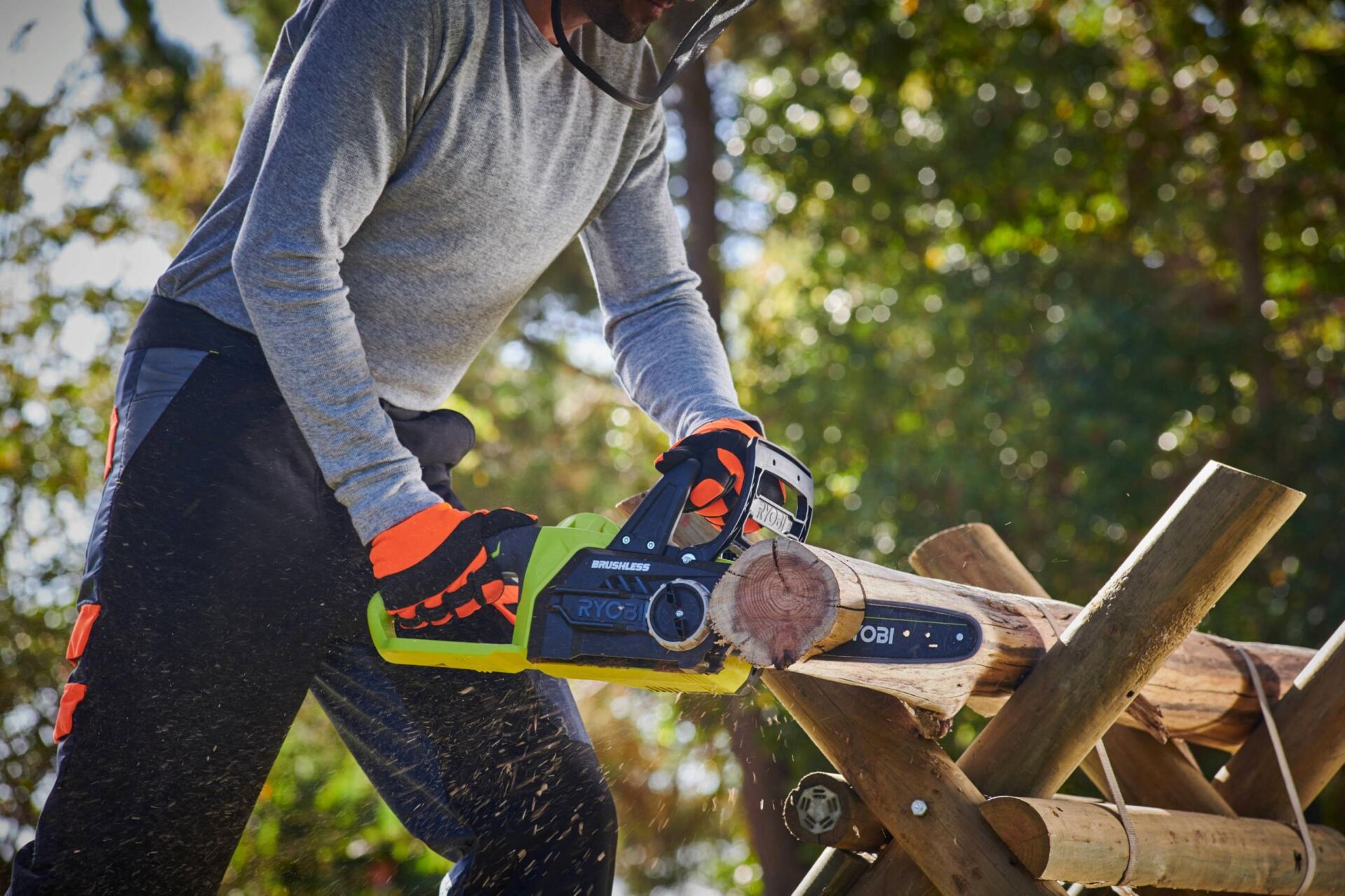 Tylny wyprofilowany uchwyt jest wygodny w użyciu w każdej pozycji podczas dłuższego użytkowania. Akumulatorowa, bezszczotkowa pilarka łańcuchowa ONE+™ o prędkości przesuwu łańcucha 10 m/s posiada mechaniczne i elektryczne hamowanie łańcucha podczas pracy.