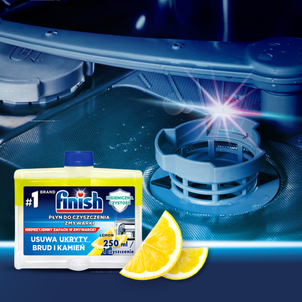 Zmywarka działa w pełni wydajnie, jeżeli przynajmniej raz na trzy miesiące stosujesz płyn do czyszczenia zmywarki Finish, który dzięki swojej dwuwarstwowej formule usuwa brud i kamień i zapewnia higieniczną czystość.